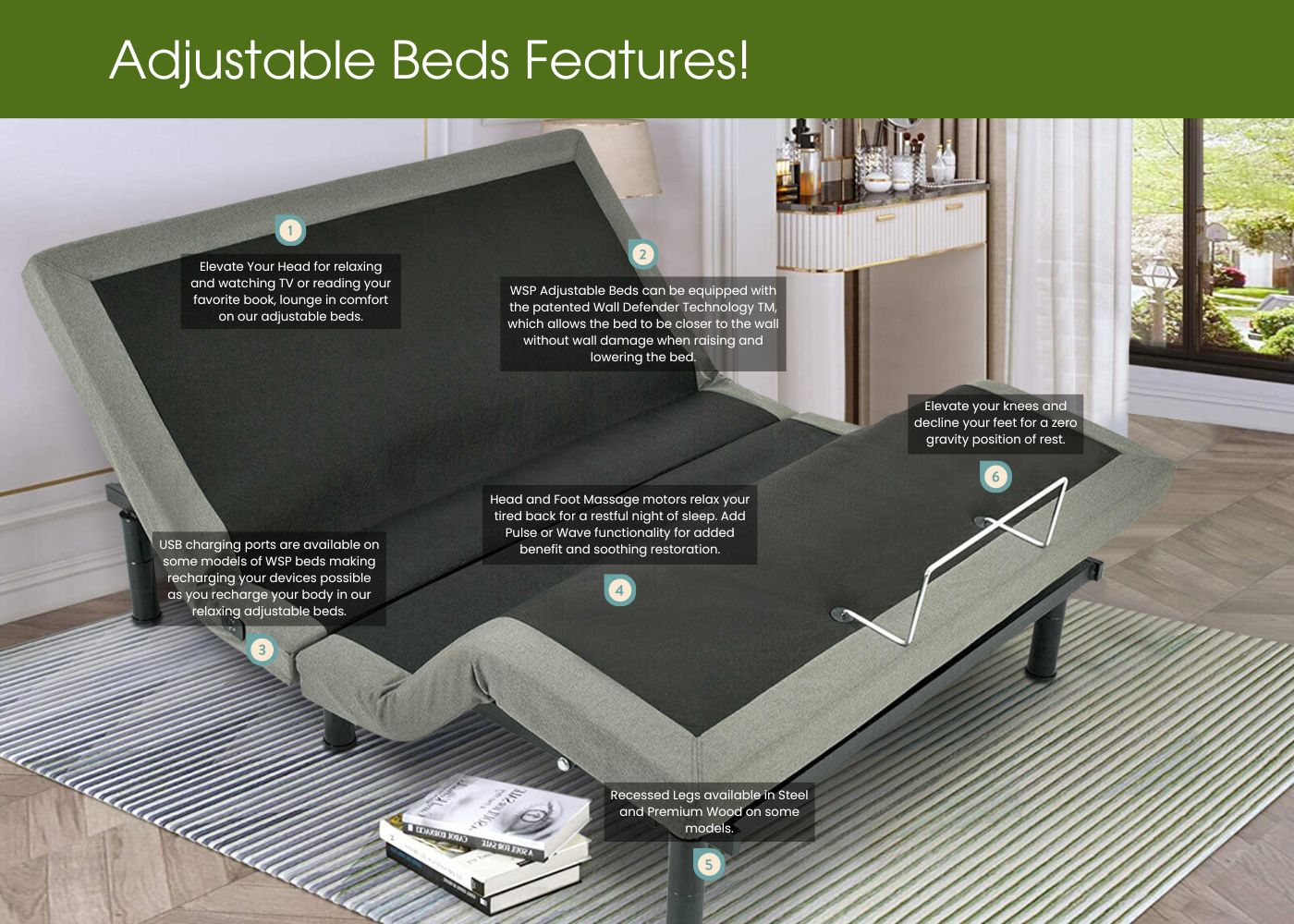 Sleep is a vital component to a healthy lifestyle, you should wake up feeling rejuvenated and ready for your day. Sleep affects how you look, feel, and perform throughout the day. Wake refreshed with one of WSP’s Adjustable Beds.