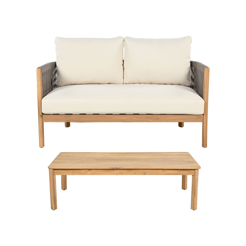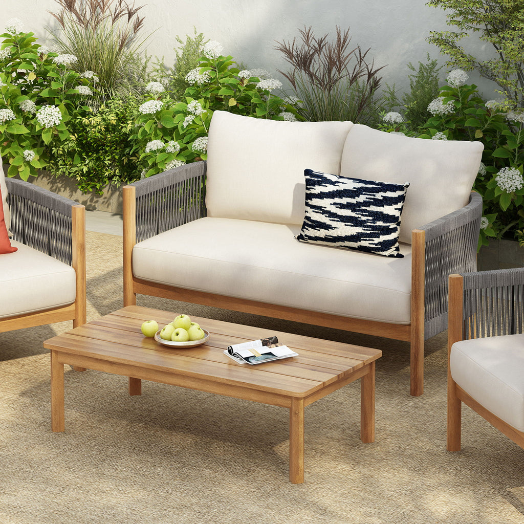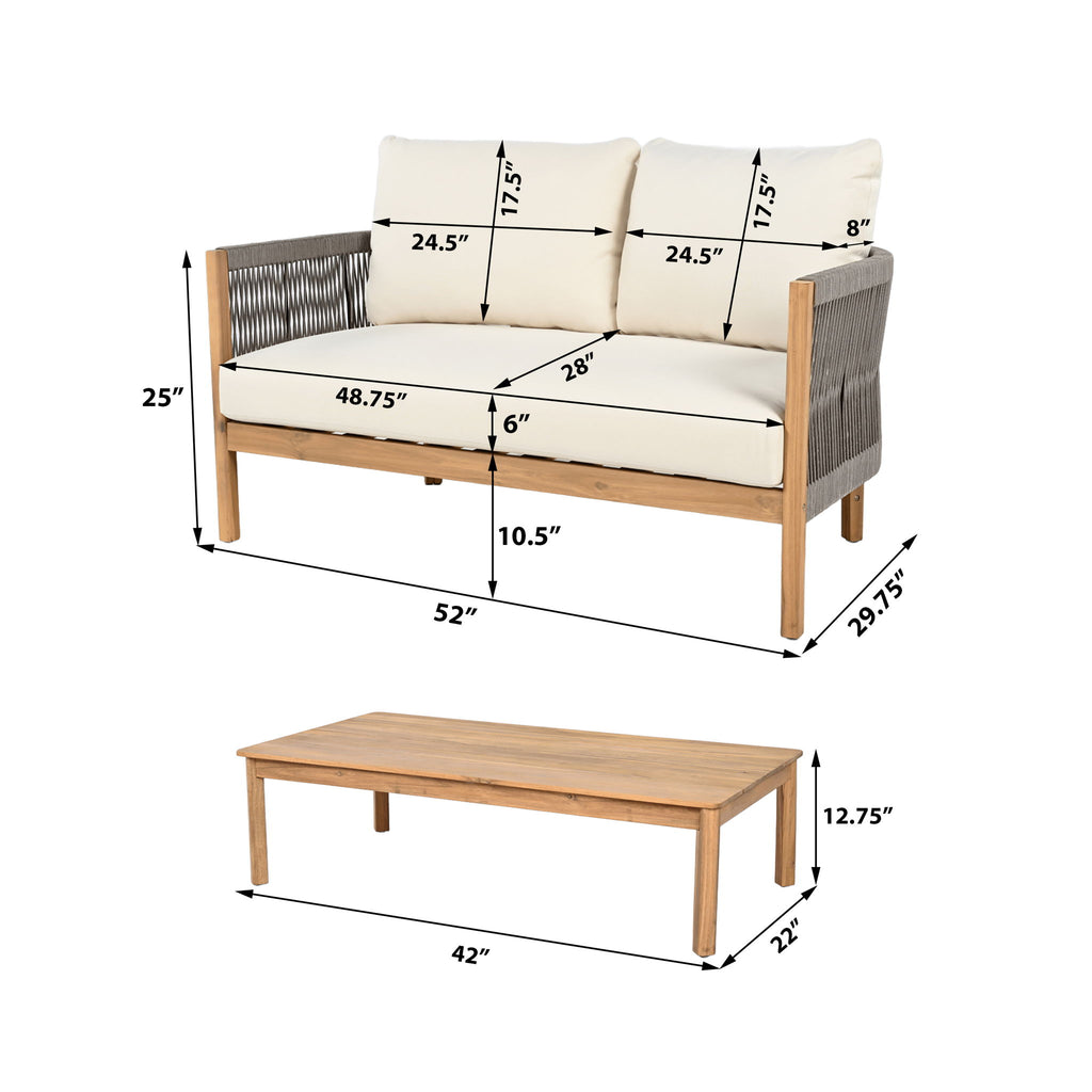 2 Pieces Outdoor Acacia Furniture Set, Woven Rope Outdoor Patio Loveseat, 2 Seat Deep Seating Group With Cushions And Coffee Table For Porch - Teak / Gray / Beige