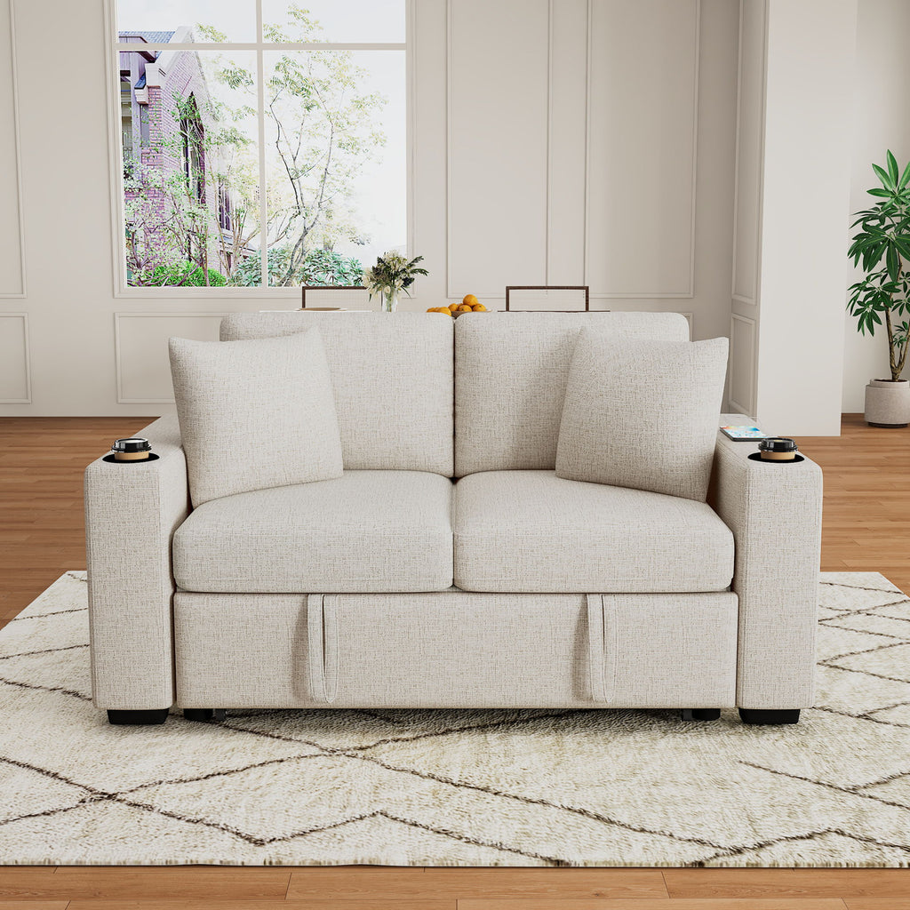 2 Seater Loveseat Sofa With Pull Out Bed, USB Charging, Dual Cup Holders - Beige