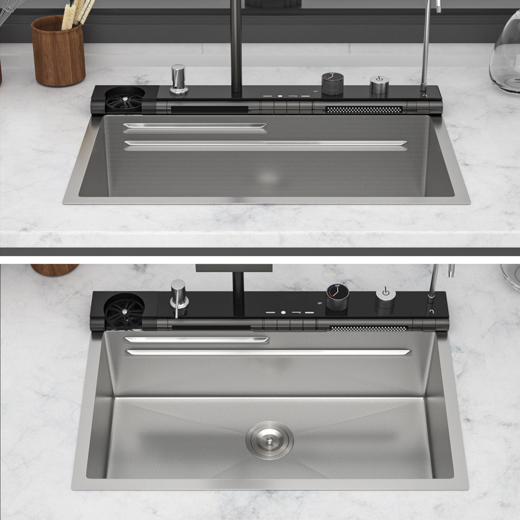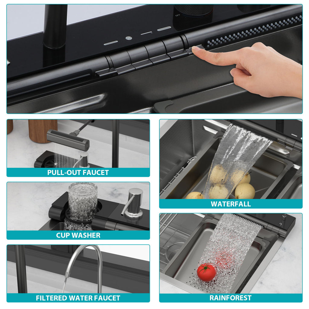 30" Kitchen Sink Waterfall Single Bowl Ledge Workstation With Smart LED Faucet, 16 Gauge T304 - Brushed Nickel