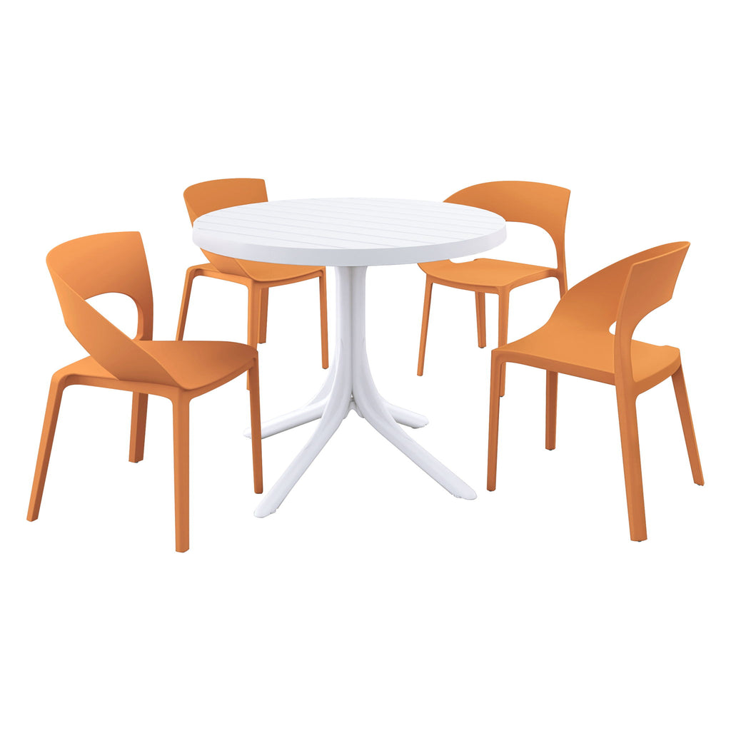 - Durability: Powder-coated metal table legs resist wind, rain and humidity without easy fading. The tabletop and chairs, made of polypropylene, have stain, wear and UV resistance (suitable for over 17,520 hours of outdoor use).