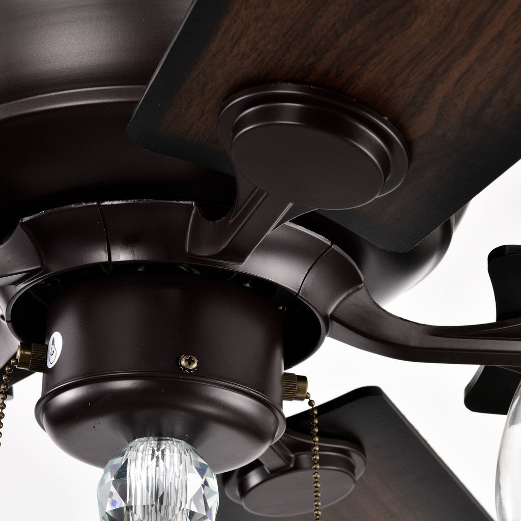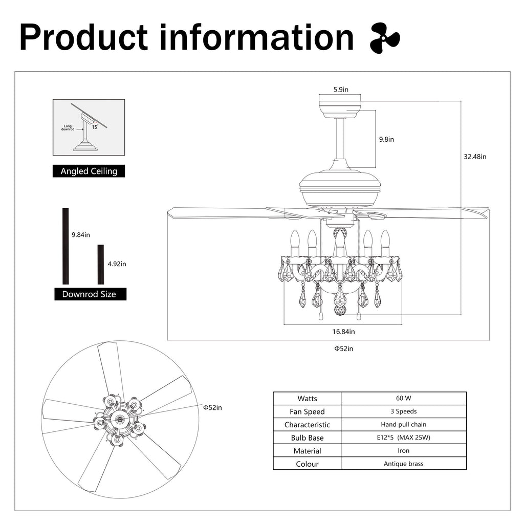 52" Crystal Shade Ceiling Fan Lamp, 3 Speed, 4 Timing, 5 Reversible Blades Crystal Ceiling Fan, 5 Pieces X E12 (No Include Bulb), Hand Pull Chain - Matte Black