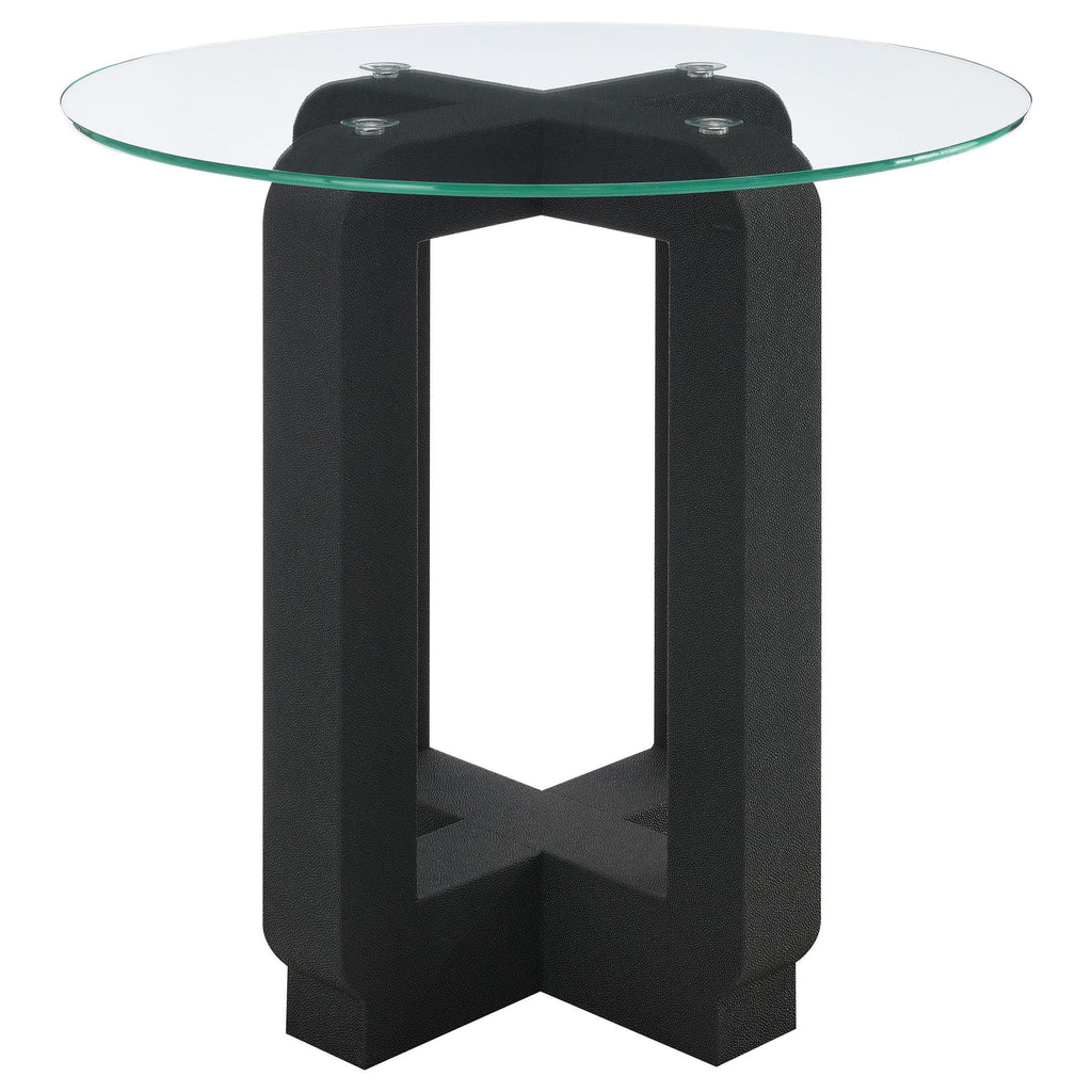 Black faux leather creates intriguing texture for a modern round end table. Creating the perfect pedestal for a table lamp or sculptural piece, the table blends seamlessly in contemporary decor. Its round top is made from clear glass, adding airy appeal to the clean, strong lines of its base. Four C-shaped legs create a unified, open presentation with crossing details that add depth and artistry. Showcase a vase of fresh-cut flowers in your entry or add a table lamp in your living room seating area.