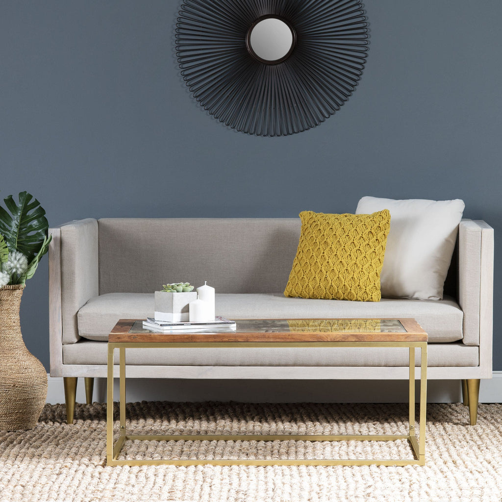 For the perfect blend of contemporary design and expert craftsmanship, look no further than the Adagio Laser-Cut Acacia and Iron Cocktail Table with a glass top. Produced of natural acacia wood, this design features a hand-carved palm leaf pattern tabletop under a clear glass overlay. A lustrous gold-leaf metal frame adds stability and modern elegance to the overall piece while the earth tones of the wood celebrate the beauty of nature and organic elements, making for a stunningly unique cocktail table.