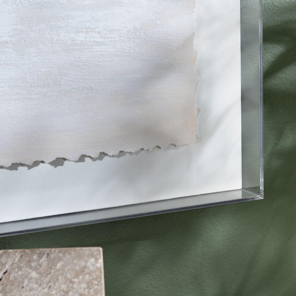 Introducing our Serena 1 Acrylic Shadow Box Painting, a captivating masterpiece that effortlessly marries simplicity and elegance. This unique artwork is a stunning fusion of white and gold, featuring delicate, deckled edges and sumptuous gold embellishments, all beautifully presented in an acrylic shadow box frame. The deckled edges of the artwork lend a touch of craftsmanship, adding a handmade, organic quality to the piece. The heavy gold embellishments bring opulence and texture, elevating the composition to a work of art. This exquisite artwork is then delicately floated on a pristine white background, emphasizing the luminous beauty of the central piece. Encased in a crystal-clear acrylic box frame, the painting appears to float. The acrylic box not only protects the artwork but also adds a contemporary, gallery-quality presentation.