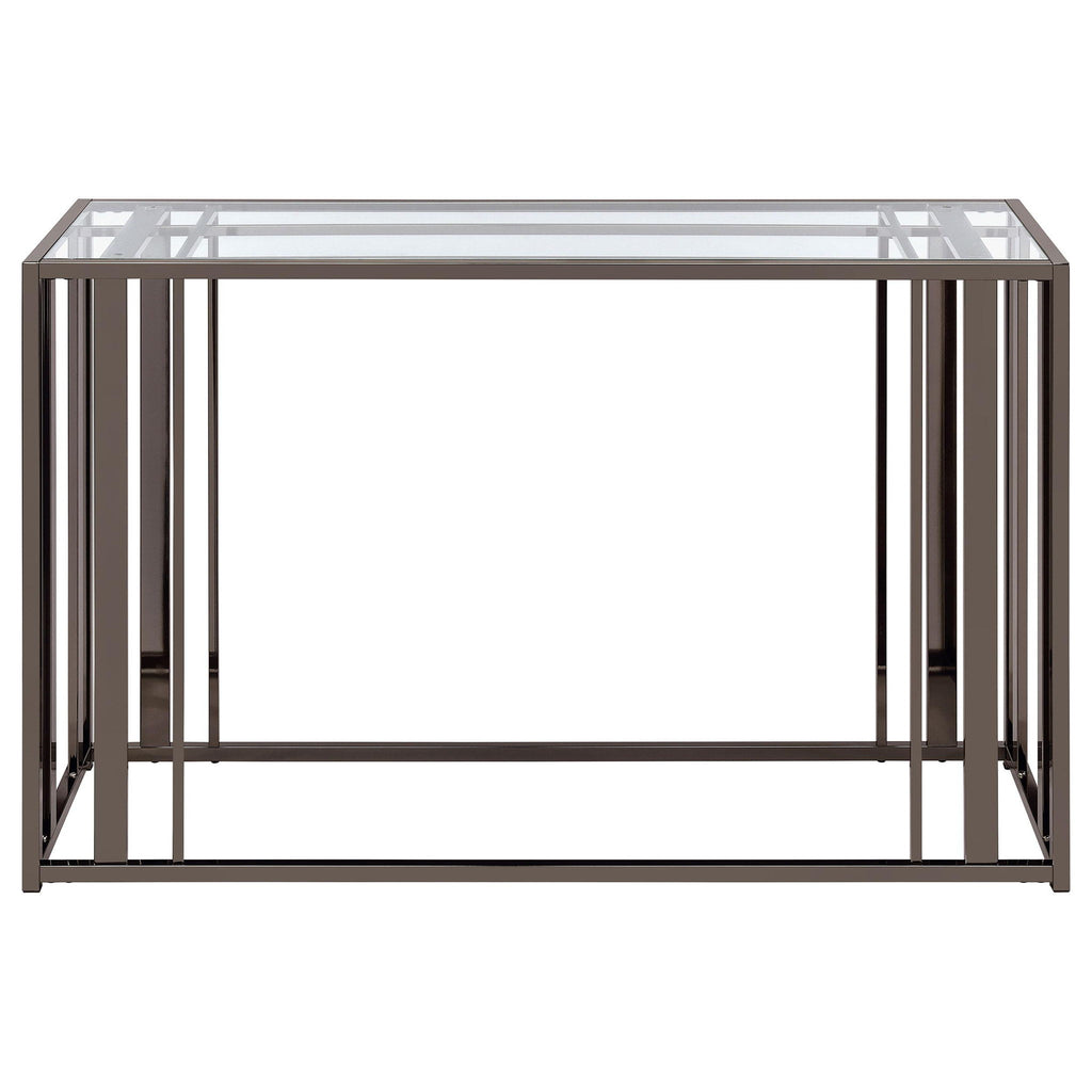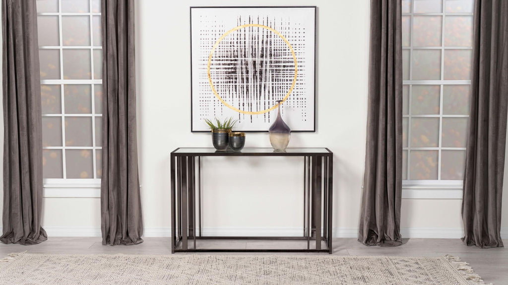 This modern rectangular console table features a clear tempered glass top paired with a geometric base crafted from heavy-gauge metal with a sleek electroplated finish. The open design creates a contemporary aesthetic, offering both elegance and durability. Ideal for placement in entryways, hallways, or behind sofas, this console table provides a spacious surface for displaying decor or organizing essentials. Its scratch-resistant materials ensure long-lasting quality with easy maintenance.