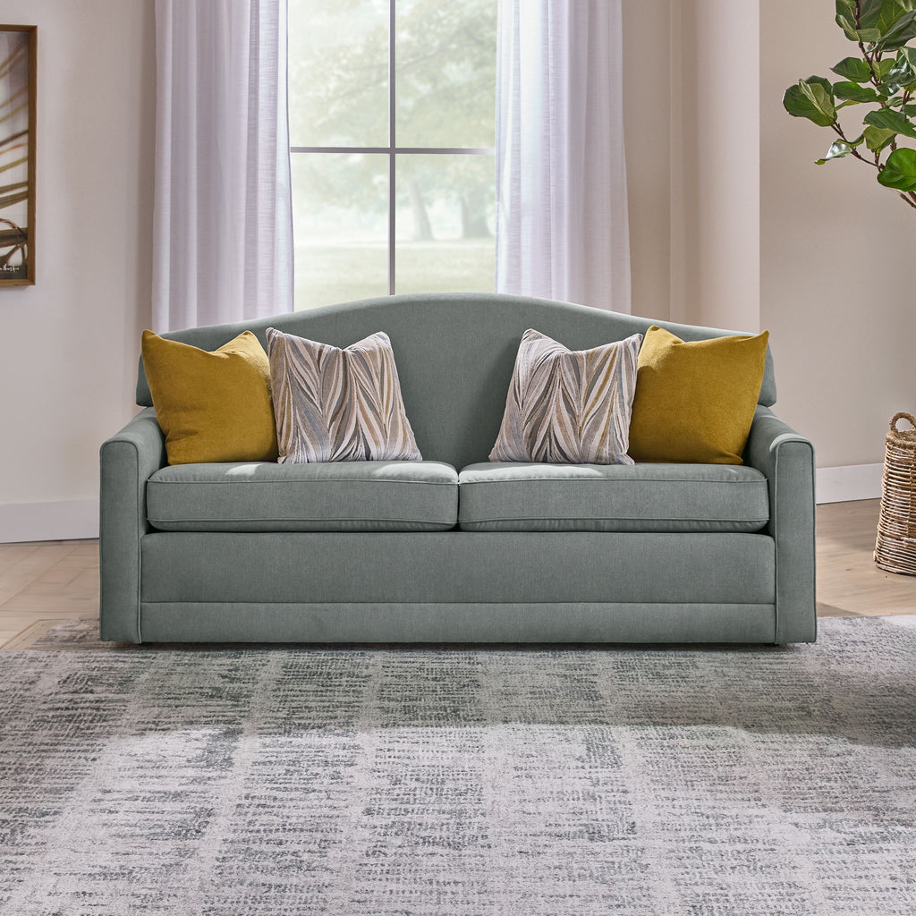 Traditional simplicity, enduring comfort. The Aggie two-cushion sofa has it all. Perched atop a to-the-floor frame that gives the illusion of weightlessness, the Aggie two-cushion sofa is all soft corners and classic silhouettes. Adorned with a small welt trim detail, Aggie brings timeless simplicity together with enduring luxury. Upholstered in your choice of fabric, including sustainable and performance options, the Aggie two-cushion sofa is sure to be the centerpiece of your living room for generations. Bring timeless traditional comfort home, with Aggie.