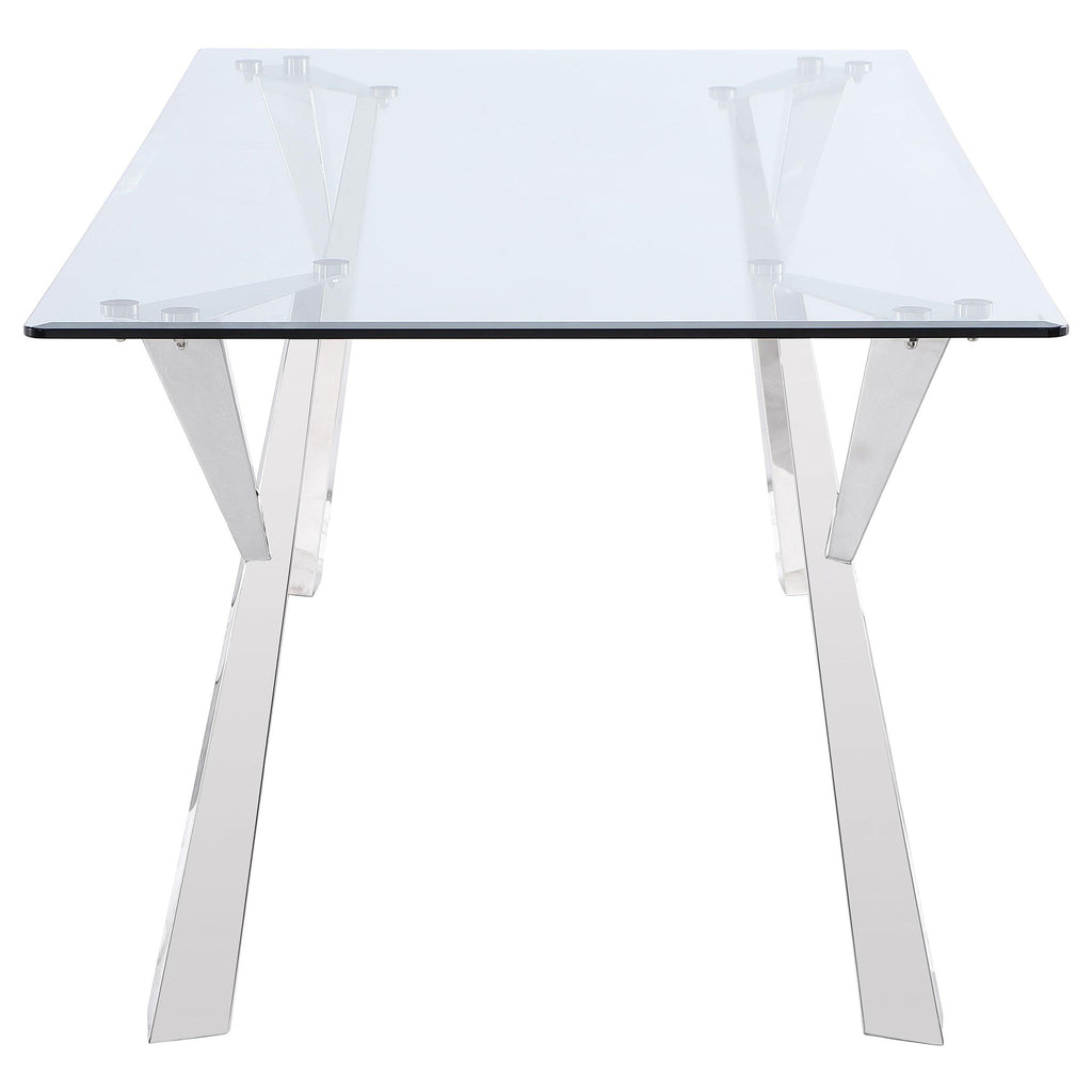 Sculptural style instantly elevates the modern glam aesthetics of a contemporary dining table. The rectangular table is topped with beautiful clear glass, complete with an elegant beveled edge for a polished look and feel in your dining room. Flared, geometric legs add sophistication and artistry, certain to capture attention for everyday dining or elegant entertaining of friends and family. A polished chrome finish brightens the look of the table and offers a neutral complement that glistens in the light. Clean and precise in style, this modern dining table is a gorgeous choice for your sophisticated space.