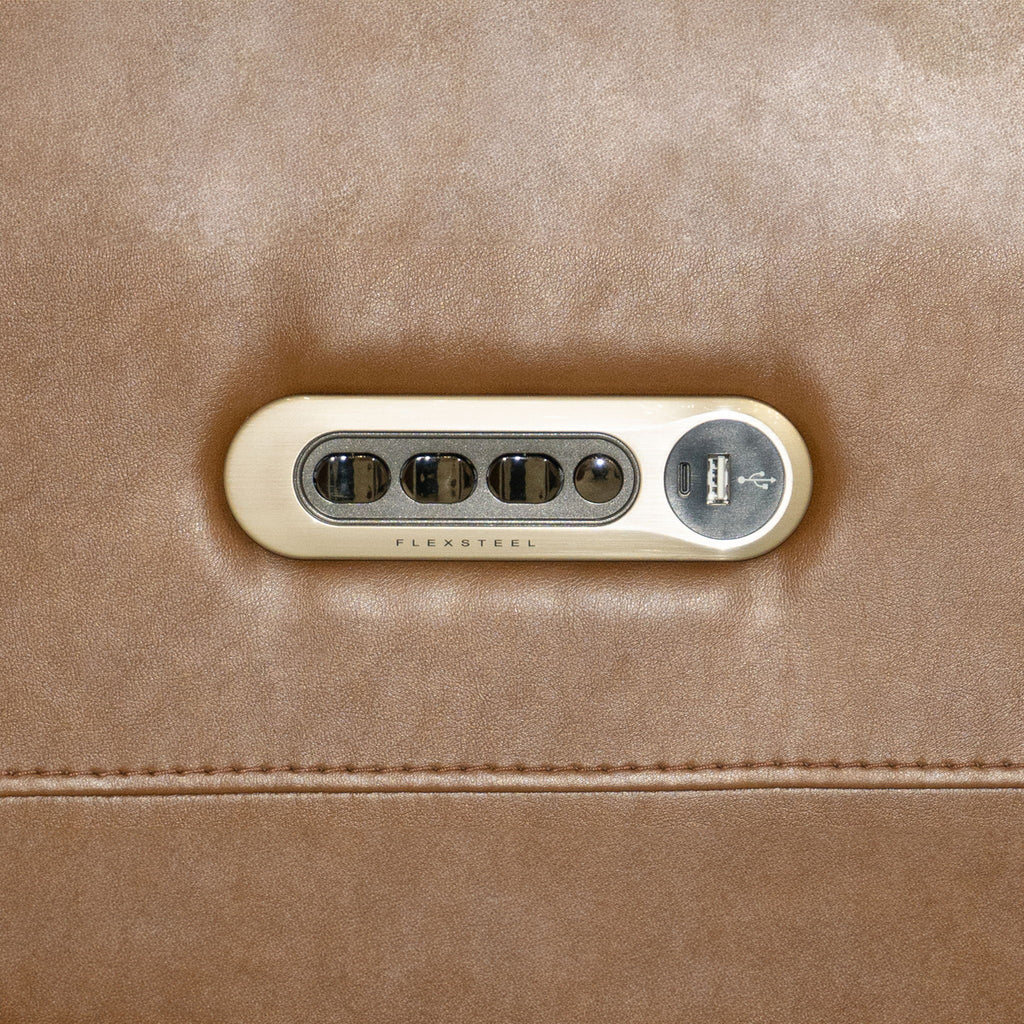 Bring your living room to the next level with the sleek, innovative Alister power gliding loveseat. This transitional style sports sleek curves upholstered in your choice of luxurious top-grain leather. A step above typical reclining, these gliding seats provide a smooth, versatile, and unique experience. The ultimate in futuristic comfort, this loveseat includes a center console with two cupholders, a wireless charging pad, and storage to keep your devices charged and within reach. Customize your comfort with a power control that adjusts recline, headrest, and lumbar support. Kick back in the Alister, the future of relaxation.