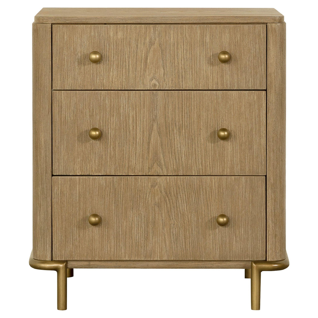 Create an elegant, natural retreat with this mid-century modern bedroom set. The design features a warm sand wash finish achieved through an eleven-step wire-brushed process for subtle texture and organic tone. Woven cane panels lend an airy, handcrafted feel, framed by solid wood and metal accents in aged brass. Smooth curves and clean lines define each piece, combining refined craftsmanship with modern functionality to bring a calming, sophisticated presence to any bedroom space.