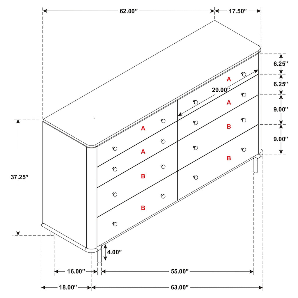 Sophisticated and timeless, this eight-drawer dresser blends mid-century modern design with subtle coastal charm. Its sand wash finish reveals a wire-brushed texture that enhances the natural wood grain. Round aged brass knobs and matching tubular metal legs lend a refined touch of glamour, while felt-lined top drawers protect delicate items. With generous storage and an elegant silhouette, this dresser offers both beauty and practicality for modern and transitional bedrooms.