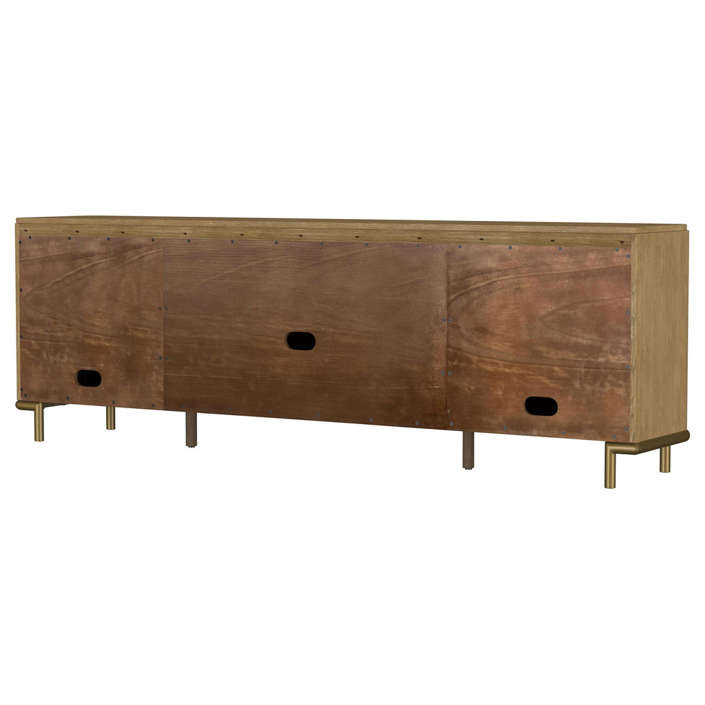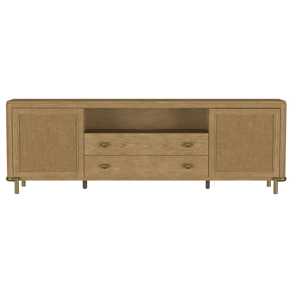 This refined entertainment unit transforms your living room with artisanal detail. Accommodating up to 85-inch displays, this TV stand integrates rubberwood, engineered wood, white ash veneer, and rattan. A modern neutral finish and aged brass legs exude timeless appeal. With drawers and hidden storage, it excels as a media console or TV shelf. A versatile TV console and media stand, it ensures an elegant entertainment center and functional media cabinet.