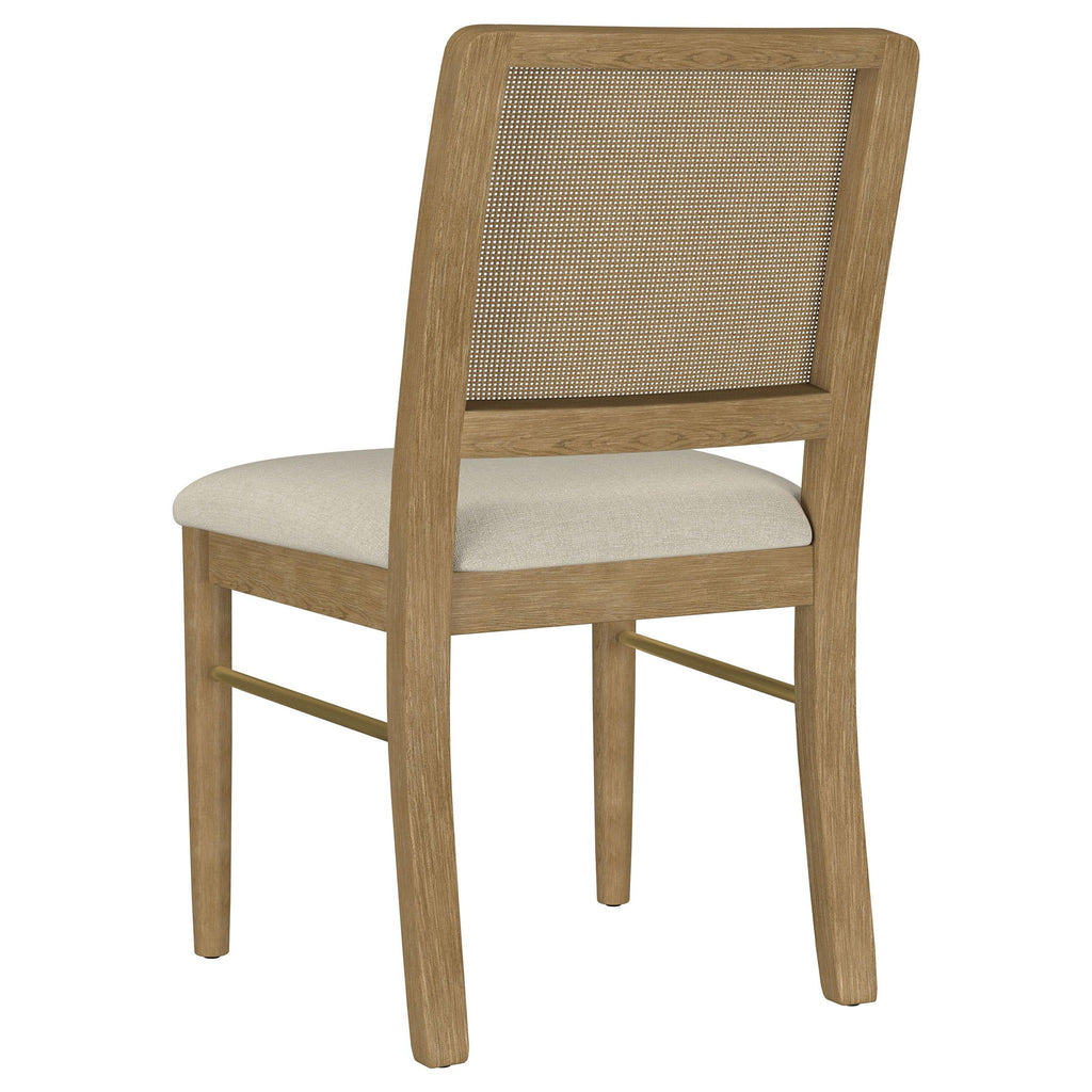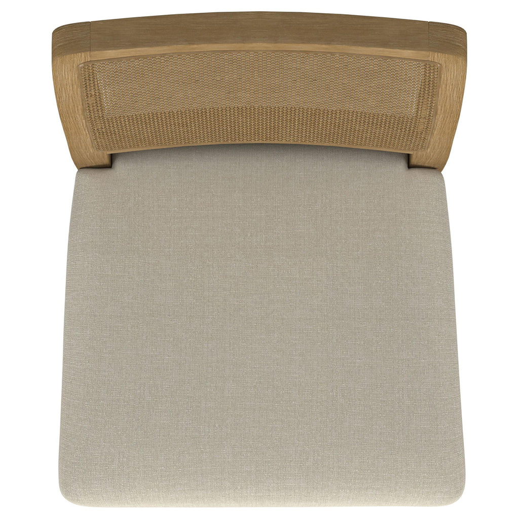 This dining chair combines modern comfort with organic charm, featuring a handwoven cane backrest crafted in Indonesia for a natural, textured appeal. The solid rubberwood frame provides durability and a warm aesthetic, while a beige linen-like upholstered cushion enhances its cozy style. Pirelli webbed seat construction ensures both comfort and lasting support. Reinforced with a sleek metal stretcher bar, this chair balances beauty and functionality.