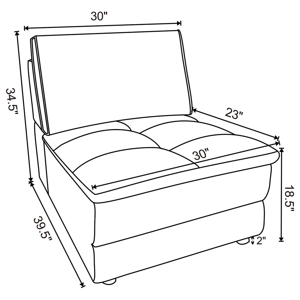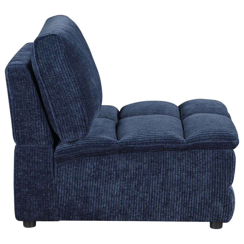 This contemporary armless chair offers a perfect blend of style and comfort for any modern living space. Upholstered in soft blue corduroy fabric, it features a sophisticated pillow top grid-tufted design that adds texture and visual appeal. Built with a fully encased solid and engineered wood frame, it delivers durability and stability for heavy use. Sinuous spring seating and pocket coil springs ensure long-lasting support, while the spacious seat provides a comfortable spot for relaxation.