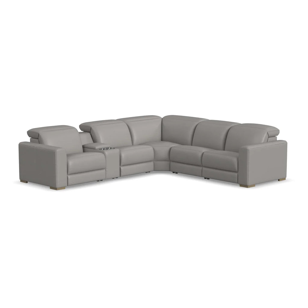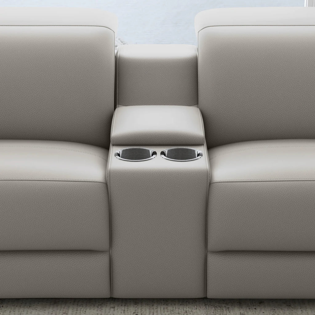 The luxurious look of upscale stationary furniture combines with functional adjustability with the Aurora power reclining sectional with power headrests. Transform your living space into a stylish oasis for relaxation and surround yourself in contemporary comfort with design features such as soft, wide track arms and a low profile, stationary look with motion functionality. The power recline and headrests help you achieve maximum relaxation, while Zero Gravity technology gives you a feeling of weightlessness. Useful features such as charging ports and a storage console offer added convenience of keeping mobile devices powered and drinks close at hand. Upholstered in two neutral color choices of durable top-grain leather, the Aurora power reclining sectional serves as a beautiful complement to any home.