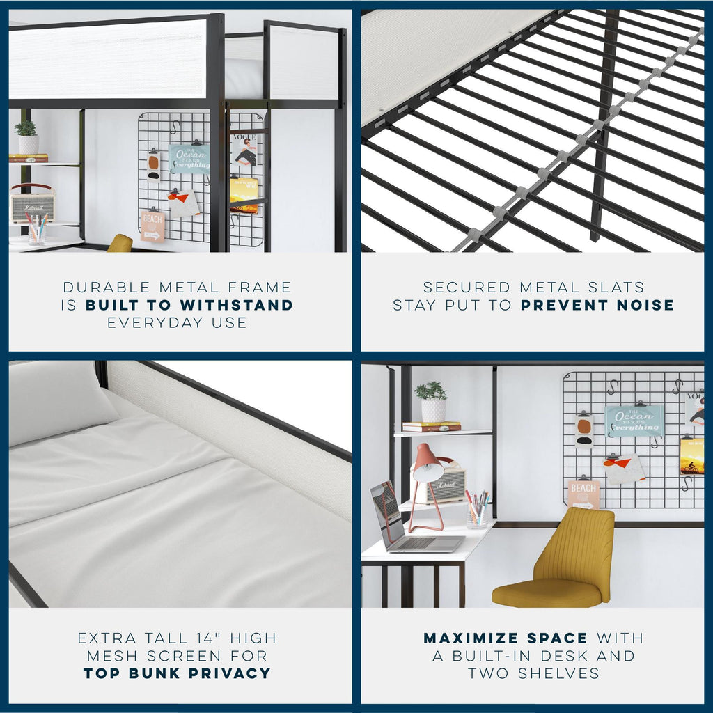 - All-in-One Functionality: Combines a top bunk for sleeping, a lower desk for studying, and shelving for storage to maximize space efficiency