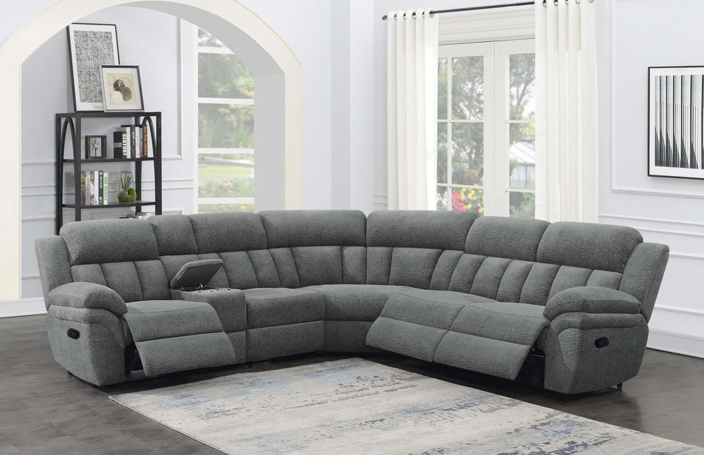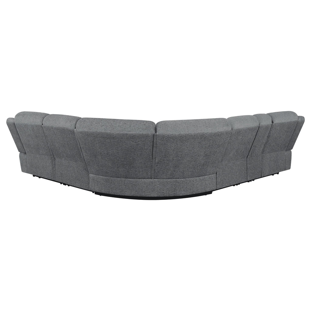 Bring comfort and convenience into your home with this six-piece modular manual sectional. Wrapped in charcoal performance chenille, it features three wall-hugging recliners that maximize space while offering cozy relaxation. A lift-top console provides storage for essentials and two stainless steel cup holders with removable inserts. Designed with supportive pocket coil seating and topped with cool gel memory foam, this sectional combines everyday durability with lasting comfort for family living or entertainment rooms.