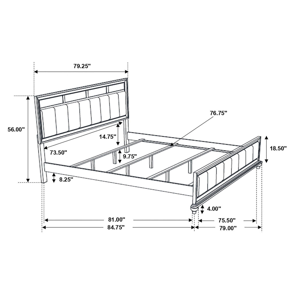 An eye-catching design with sleek style. Make any room a decor haven with this exceptional bed. Easy elegance offers a casual look with modern accents. Bold styling plays with geometric shapes in vertical and horizontal orientations. Add a glam touch with metallic leatherette upholstery.