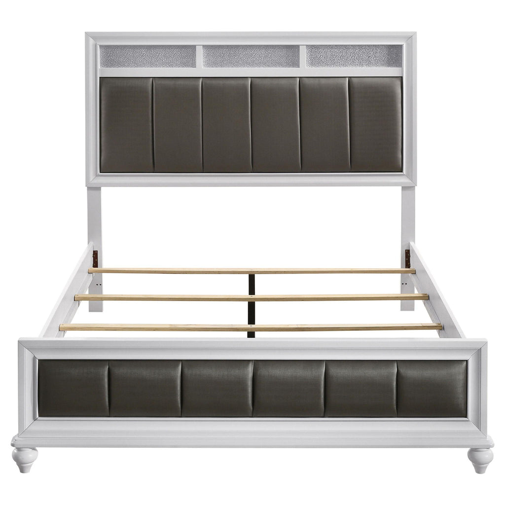 Infuse your bedroom with sleek sophistication and subtle glam with this panel bed. A tall headboard and matching footboard feature channel tufted panels wrapped in metallic leatherette, creating a striking focal point. The crisp white frame is detailed with molding for depth and finished with turned feet for timeless charm. Sparkling accents add a touch of radiance, while the bed is crafted from solid rubberwood, engineered wood, and okume veneer for strength and durability in everyday use.