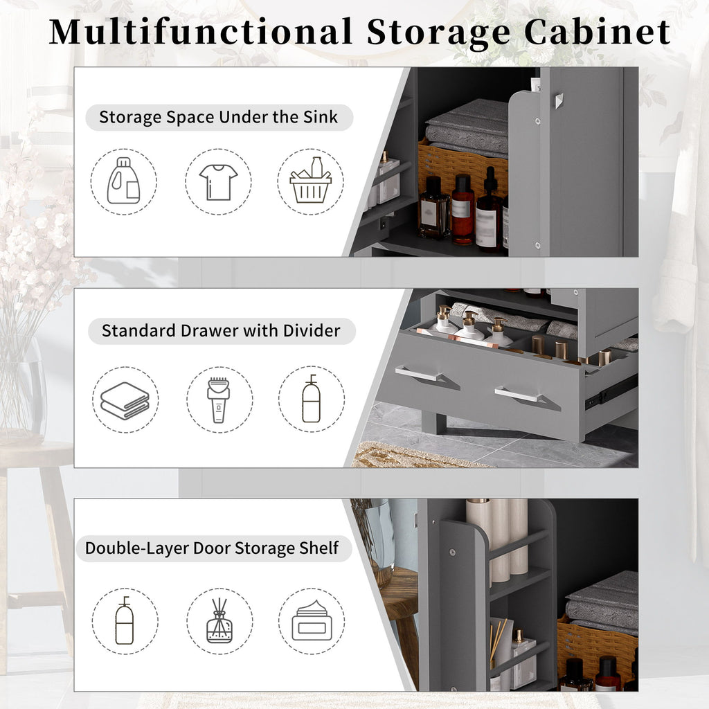 Bathroom Vanity With Integrated Undermount Sinks, Soft Close Doors, Divided Drawer, And Double Layer Door Shelves - Grey