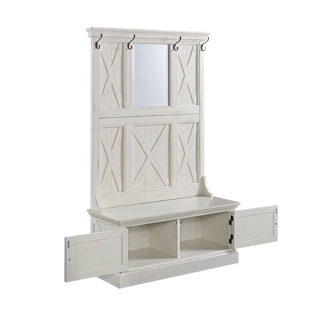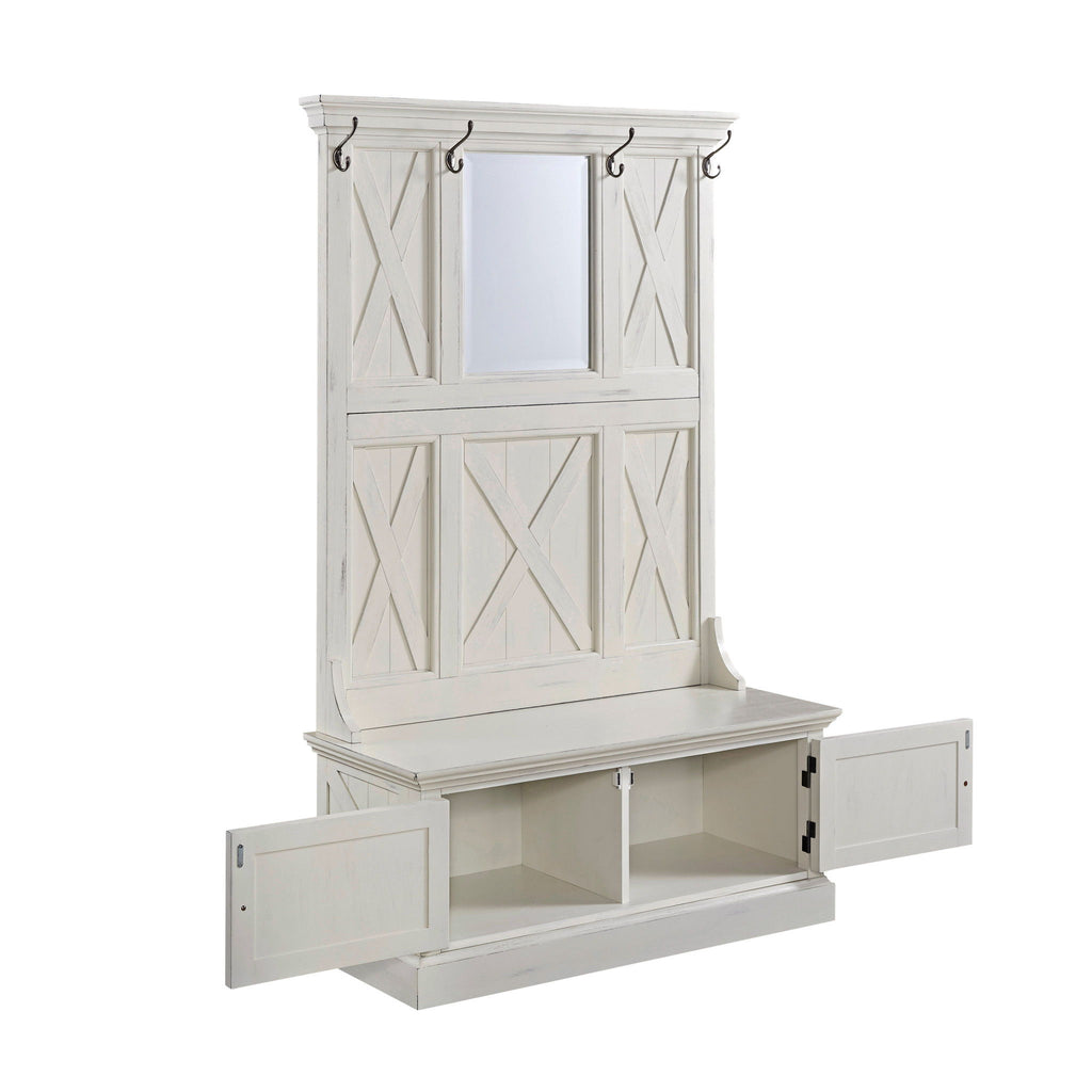 - A variety of storage options include coat hooks, a shelf, and concealed storage below the bench seat.