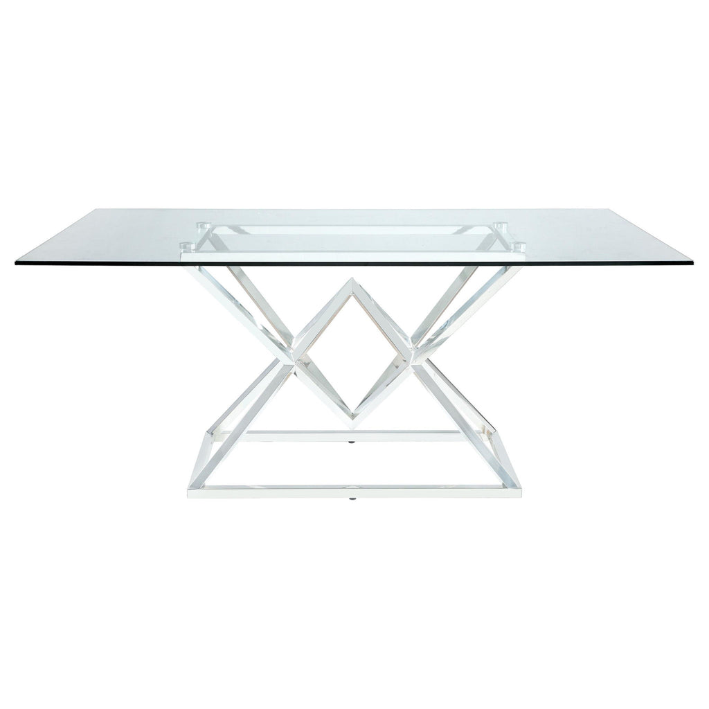 Elevate your dining space with this contemporary dining table featuring a 12mm clear glass top and an artistic polished stainless steel base. The angular geometric design adds a modern flair, while the rectangular shape offers generous space for entertaining. With its sleek materials and sophisticated presence, this table is perfect for creating a luxurious and upscale atmosphere in any dining room.