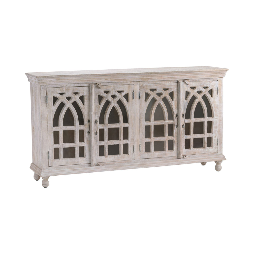 The Crestview Collection Bengal Manor Light Mango Wood Catherdral Design 4-door Sideboard boasts a tan mango wood finish. The design and finish of this piece allow it to compliment both coastal and traditional home styles well. The smooth mango wood top is the perfect spot to spruce up the area with your vases, candles, and plants.