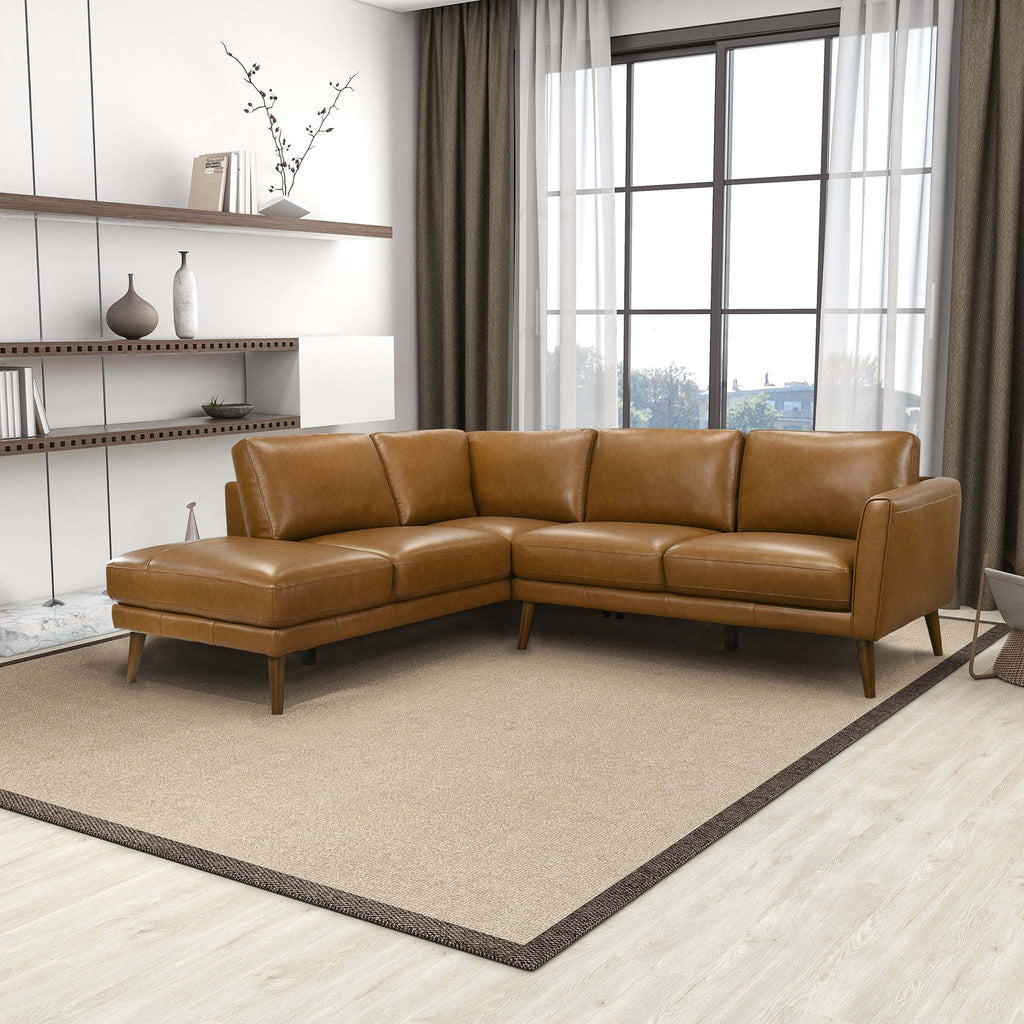 - With its plush, high-density foam cushions, it will quickly become your favorite spot in your creative space. The Benson Sectional is upholstered in a genuine leather and it can be assembled in minutes!