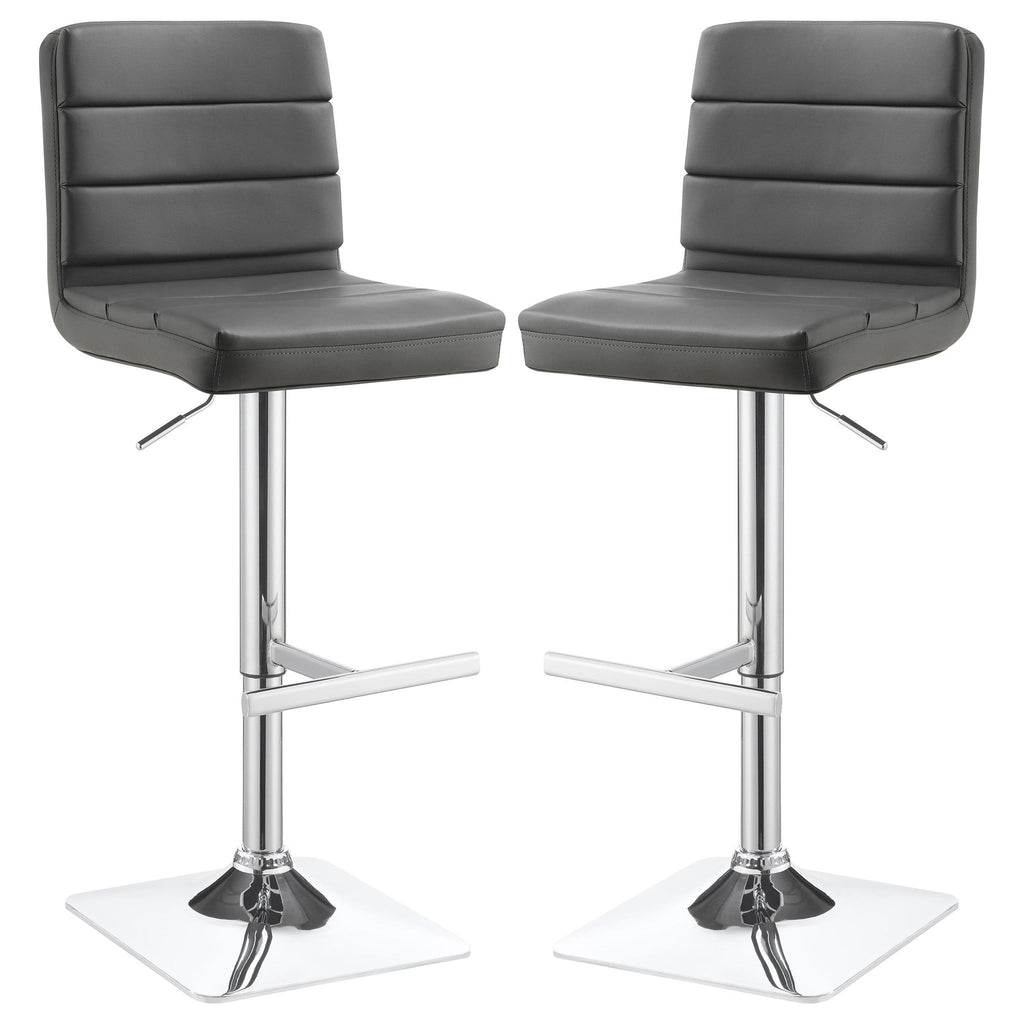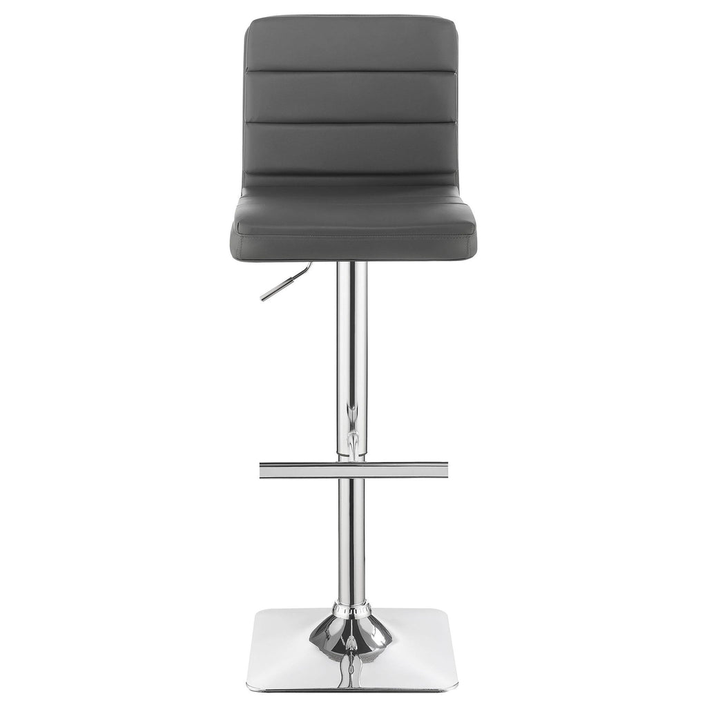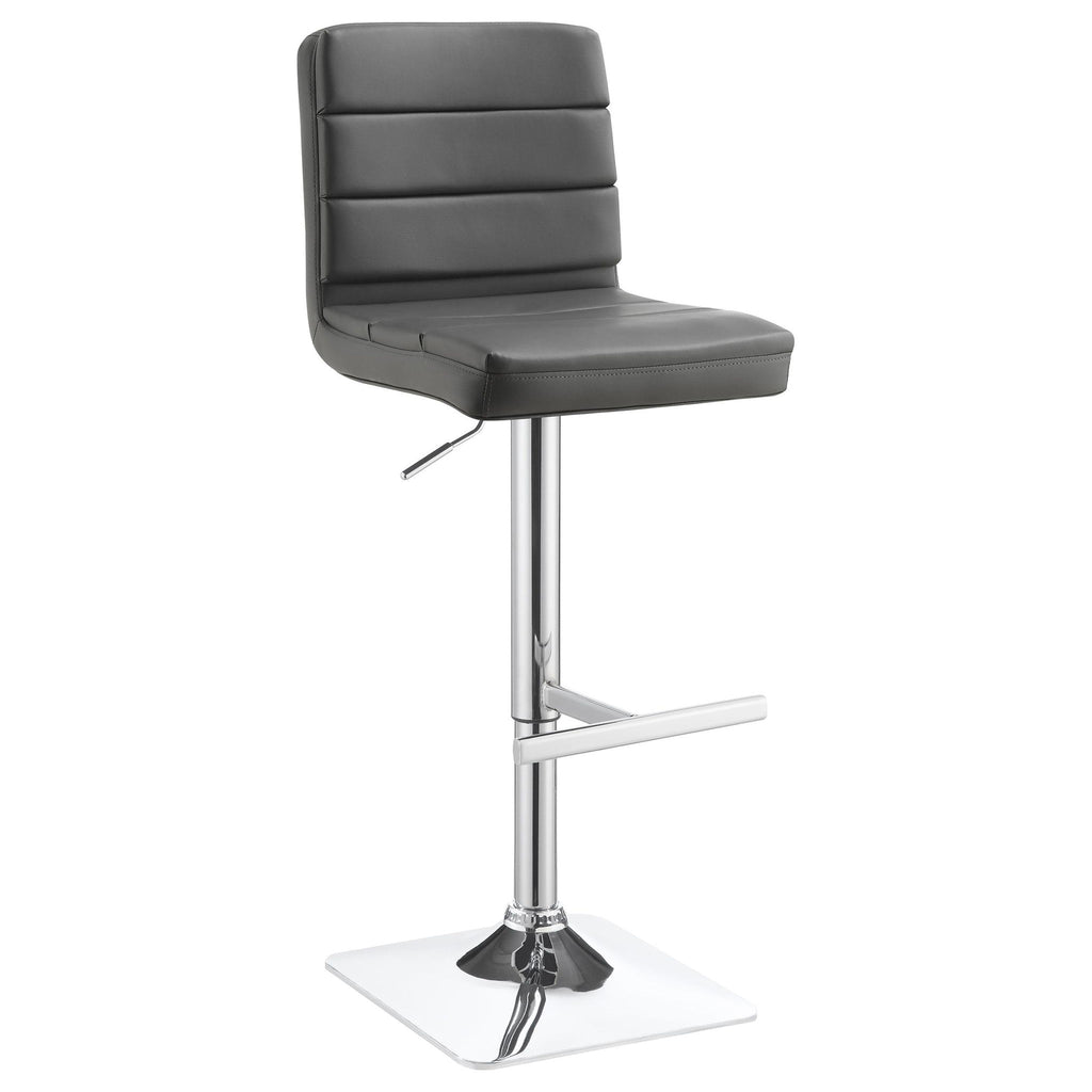Chic grey leatherette cements the contemporary credentials of this adjustable barstool. Ideal for a home lounge or remodeled kitchen island, the stool features plush cushioning and a full back for ample support and comfort. A pedestal base boasts a square foot and built-in footrest. A chrome finish gleams and delivers a sleek, refined look. With a height adjustable seat, this stool complements modern bar tables and counters.