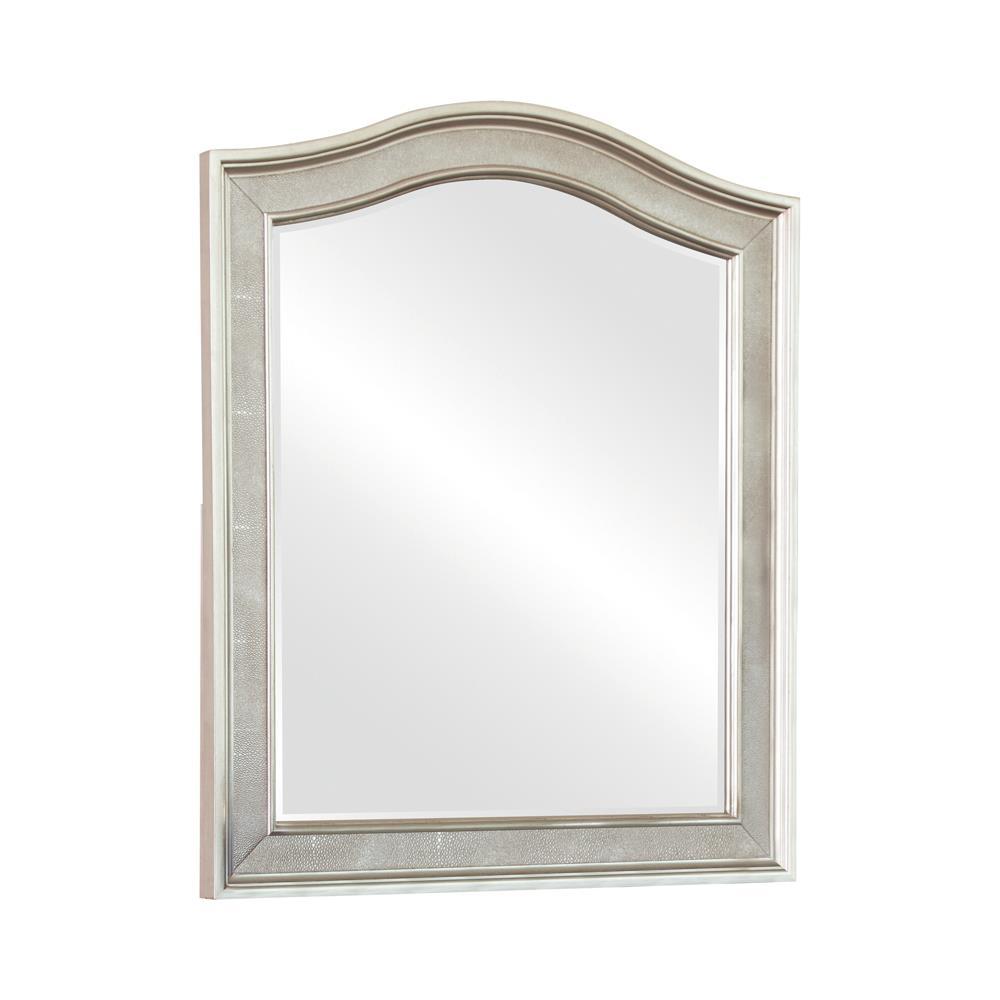 This sleek, elegant vanity mirror exudes classic style. Use it to complete a dresser or vanity table, or hang it in a bedroom, entryway, or living room to enjoy its opulent glamour. Its metallic finish and highlight glaze create depth and appeal. Its luxe look is complete with a gracefully curved frame for a sophisticated touch. The mirror can be installed vertically and looks lovely in any living space.