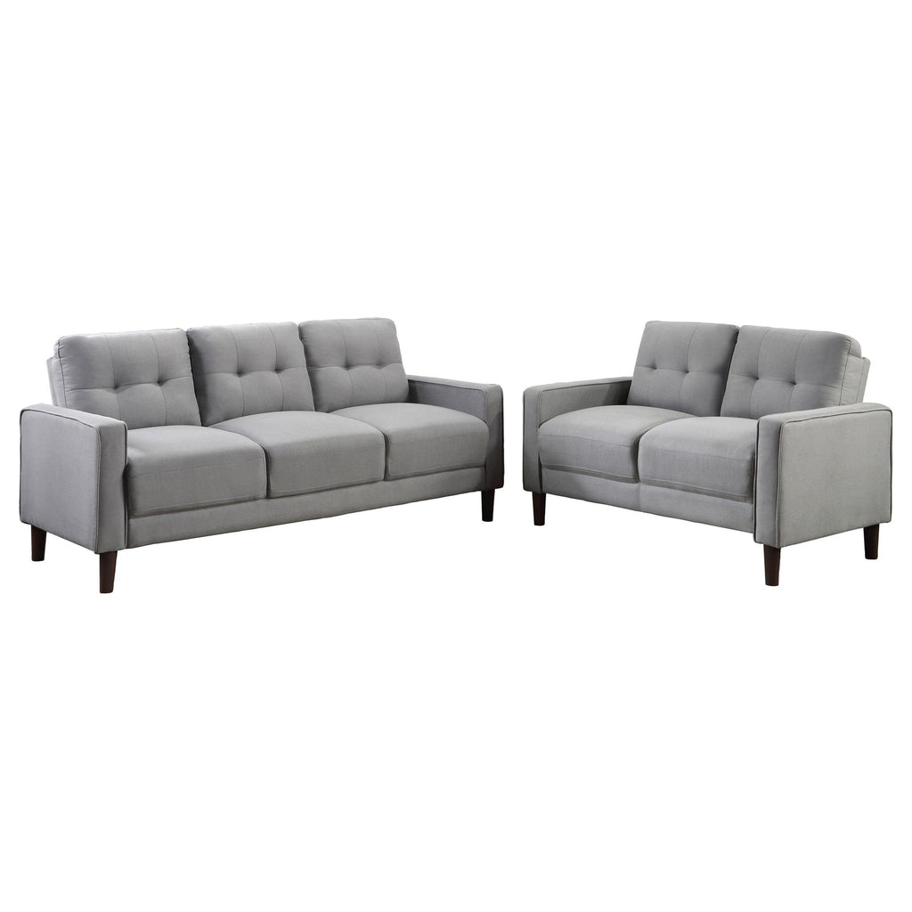This sofa set blends timeless design with modern versatility, perfect for apartments or cozy living spaces. Featuring classic track arms and precise self-welt detailing, each piece showcases refined tailoring and a compact profile. The grid-tufted back cushions and pocket coil seating offer exceptional comfort and durability, while performance fabric upholstery ensures easy cleaning and long-lasting appeal. Supported by tapered brown legs, this set brings contemporary sophistication and everyday practicality to any home.