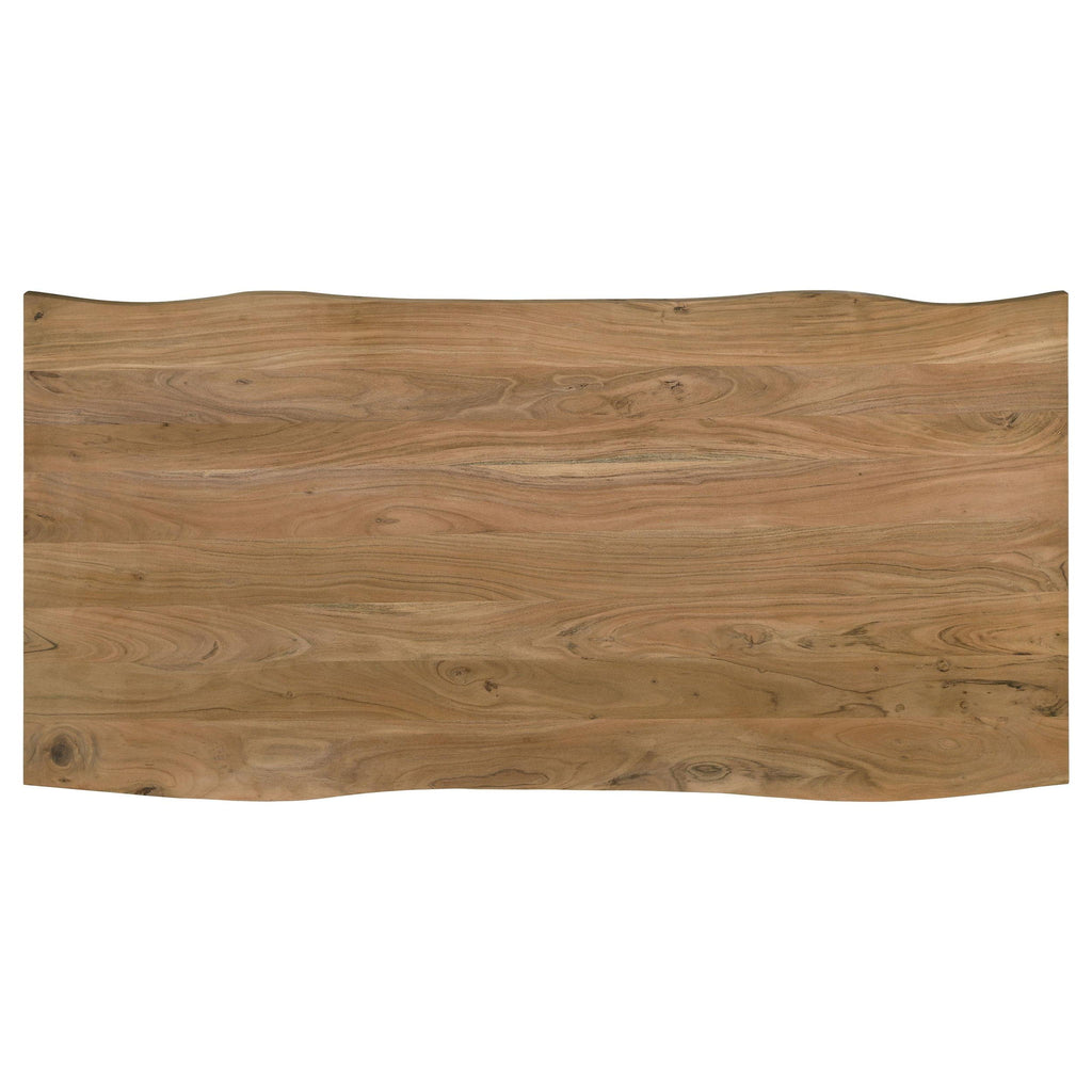 Revitalize your dining room with the exquisite beauty of this contemporary dining table. The solid acacia live edge table top boasts unique markings and stunning wood grain, adding a touch of natural charm. Contrasting with the sleek double pedestal black iron legs, this table is a captivating blend of rustic and modern styles. Make a statement with this striking centerpiece for unforgettable dining experiences.