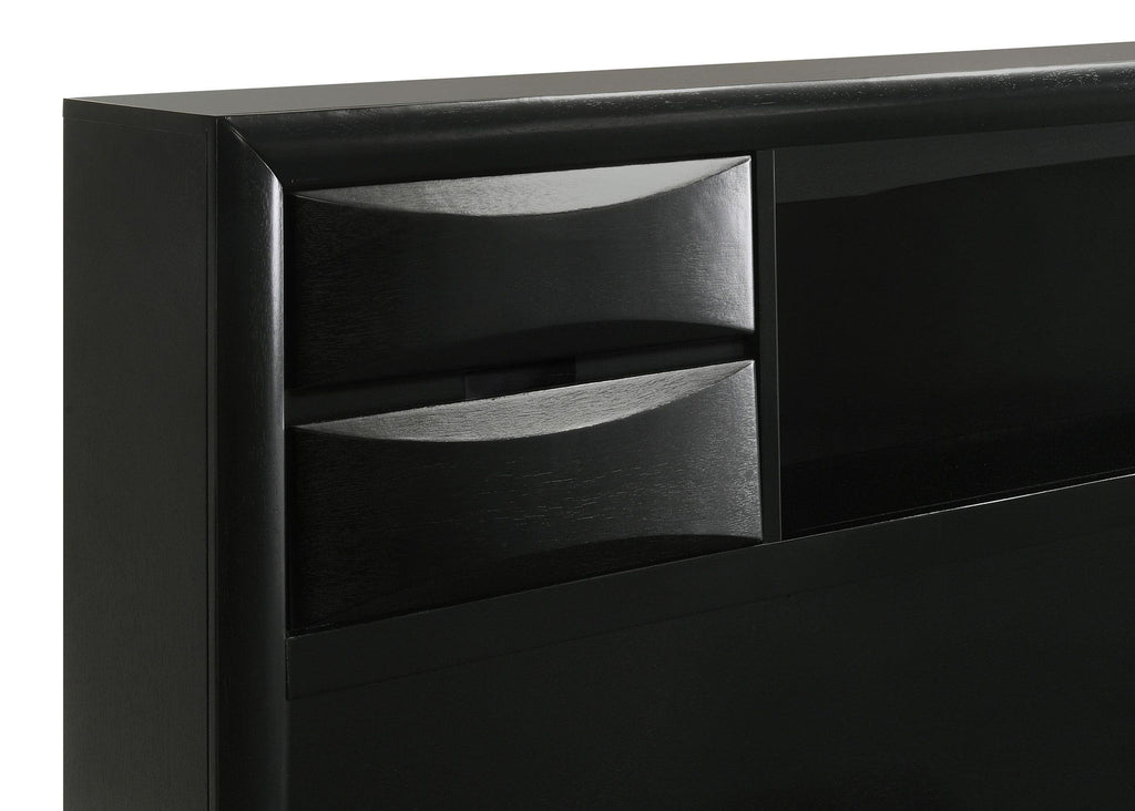 Transform your bedroom with this sophisticated storage bedroom set that combines timeless style and practical function. Finished in sleek black, the platform bed features four drawers in the footboard and hidden compartments behind drop-down doors on the headboard and side rails. The bookcase headboard includes four drawers and a center shelf for accessible storage. Complementary case pieces echo the look with chambered drawer fronts and brushed nickel hardware, creating a refined and cohesive space.