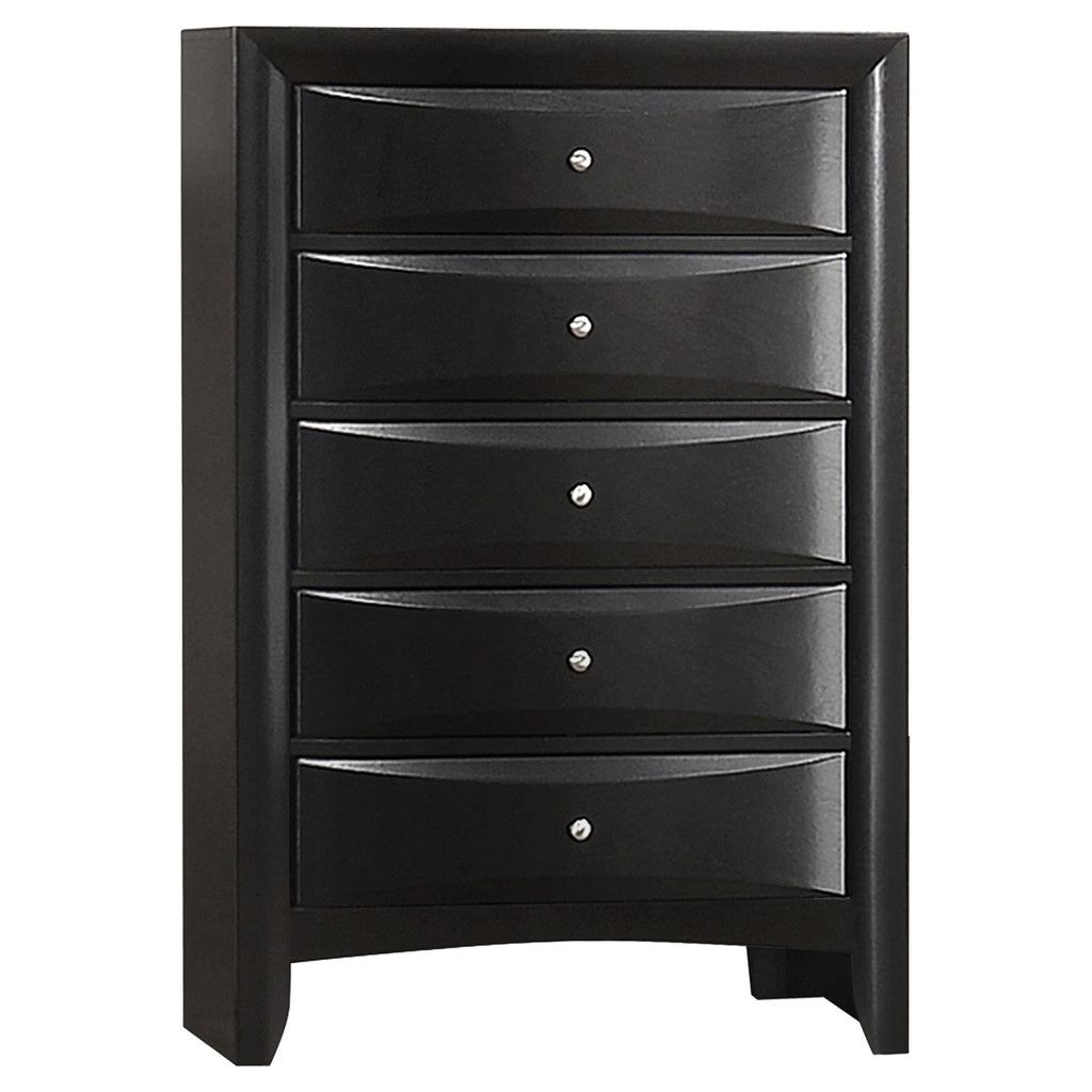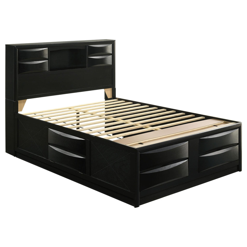 Transform your bedroom with this sophisticated storage bedroom set that combines timeless style and practical function. Finished in sleek black, the platform bed features four drawers in the footboard and hidden compartments behind drop-down doors on the headboard and side rails. The bookcase headboard includes four drawers and a center shelf for accessible storage. Complementary case pieces echo the look with chambered drawer fronts and brushed nickel hardware, creating a refined and cohesive space.