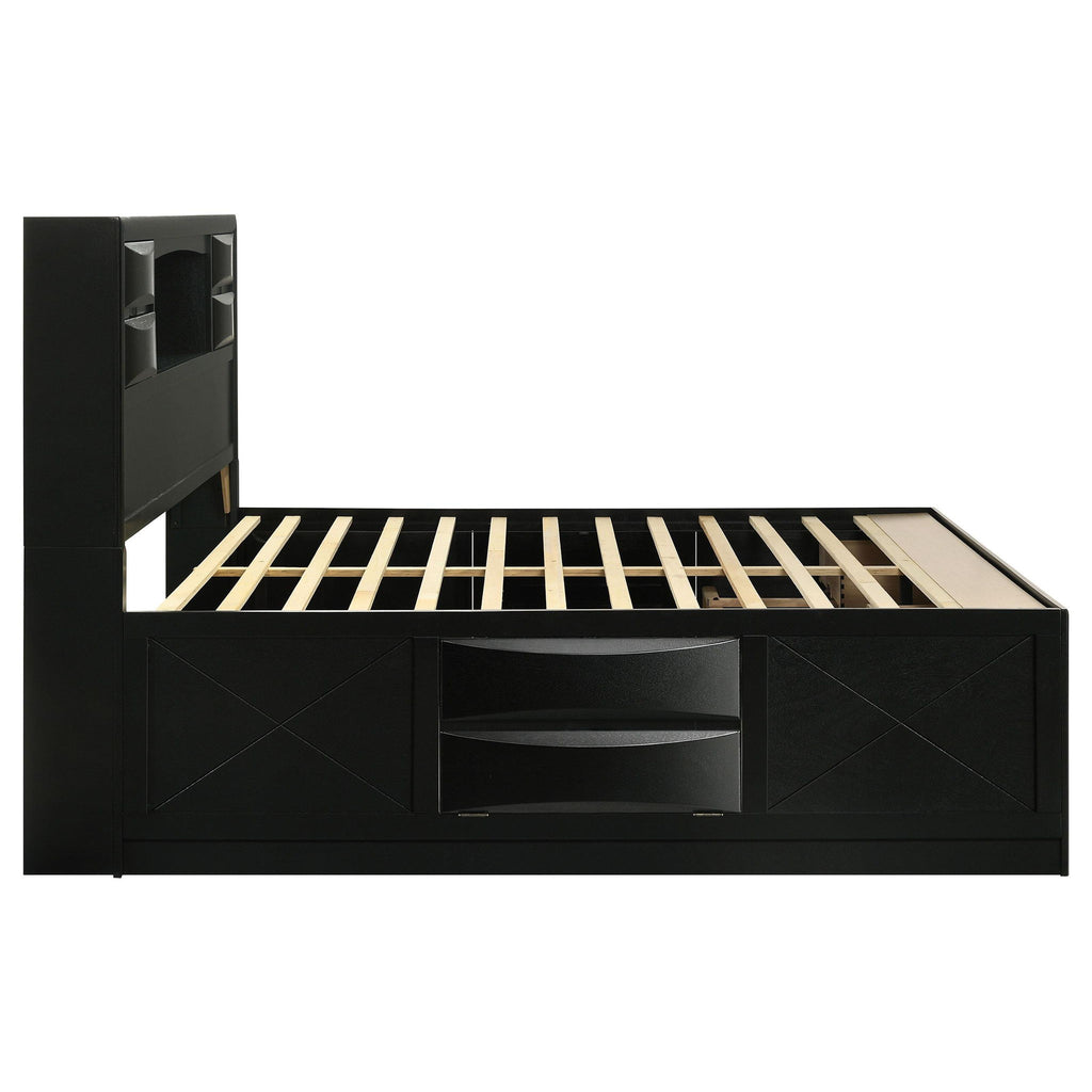 Elevate your bedroom with this modern bookcase storage platform bed finished in rich black. Thoughtfully designed for style and utility, it features four drawers in the headboard, four in the footboard, and convenient drop-down doors along the side rails for easy storage access. The bookcase headboard includes open shelving for books or décor, combining practicality with sleek design. Crafted from rubberwood, engineered wood, and okume veneer, this platform bed delivers lasting quality and eliminates the need for a foundation.