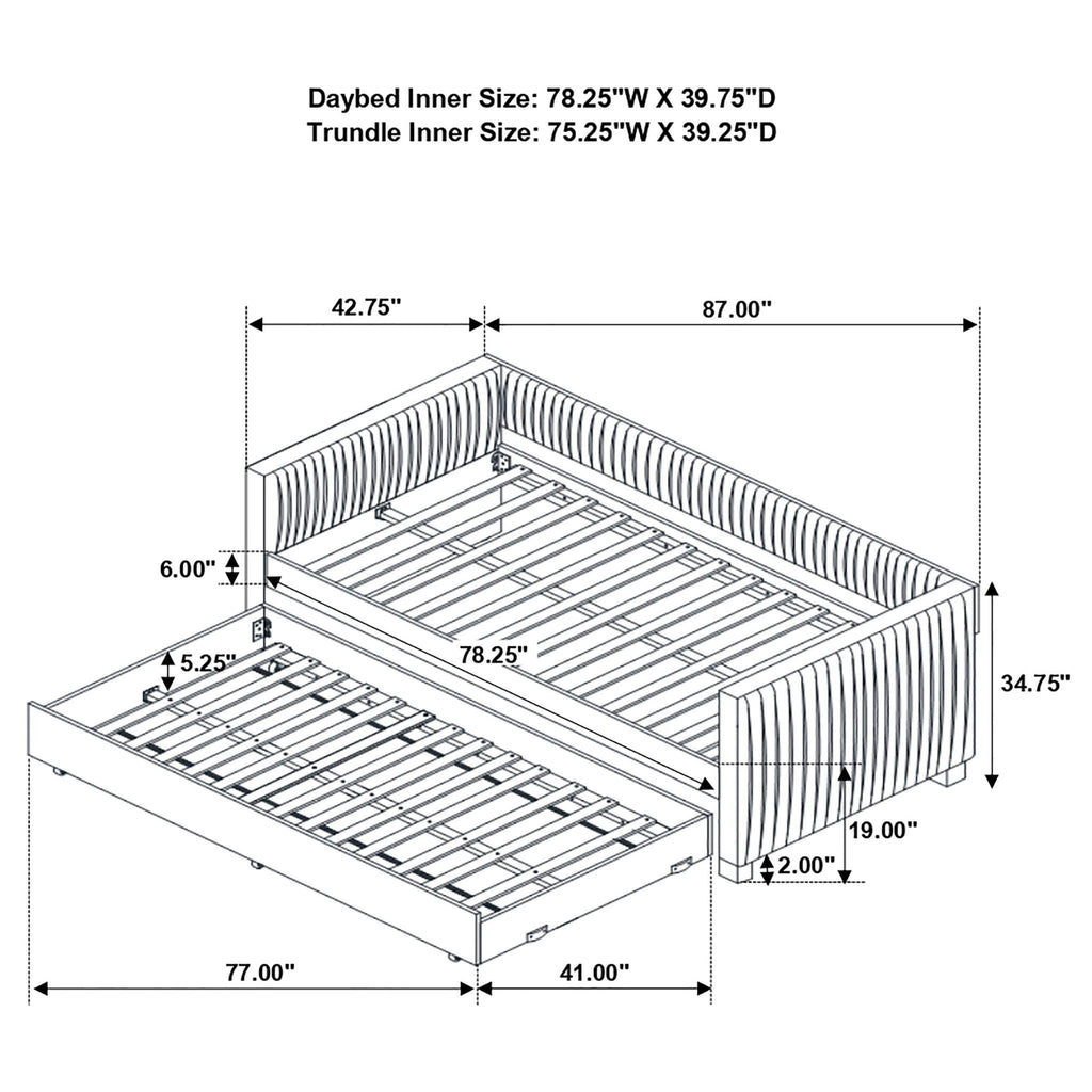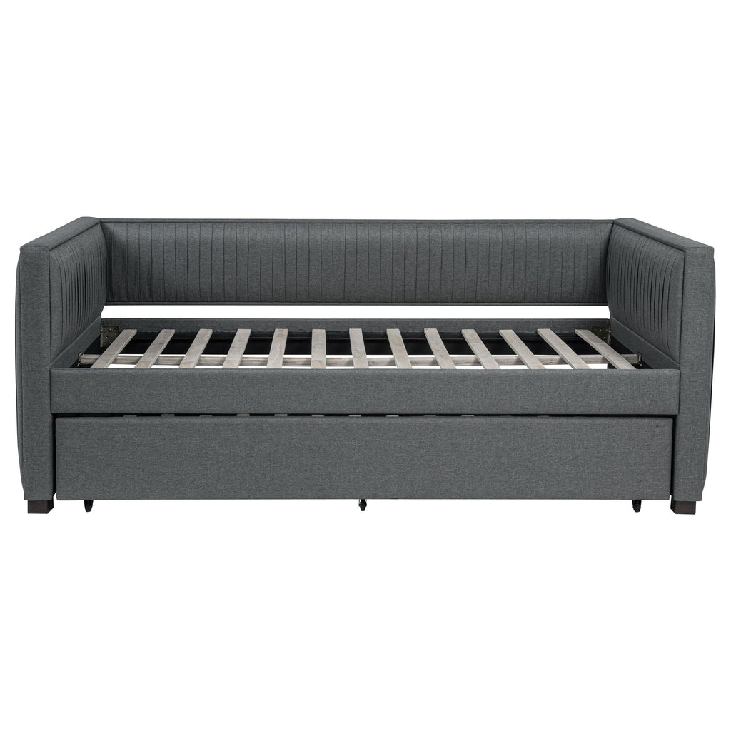 A gray fabric, pleated and overlapping along the surface of this twin daybed and trundle set, create a textured appearance against the clean straight lines. The narrow arms and backrest invite you to get creative with your own accent pillows and throws, opening this furniture piece up to becoming a lounge sofa or a bed for additional overnight guests. A trundle slips beneath the main frame when not in use or can be retrieved and glided out effortlessly. Black finish feet add slight elevation and a pop of contrast against flooring and rugs too. This twin daybed trundle set is the perfect addition for compact, multipurpose spaces like home offices and guestrooms.