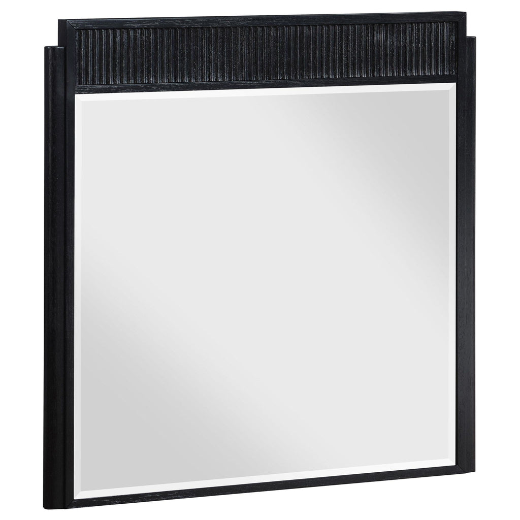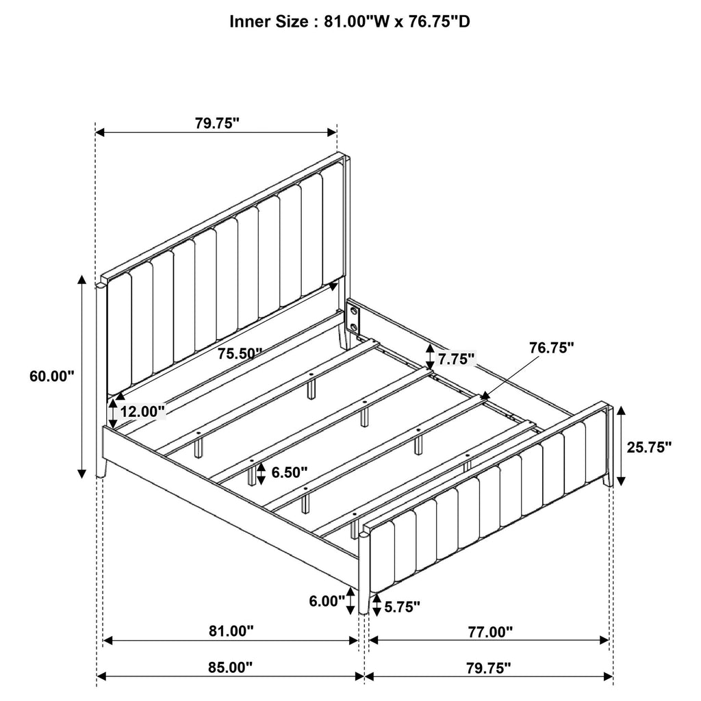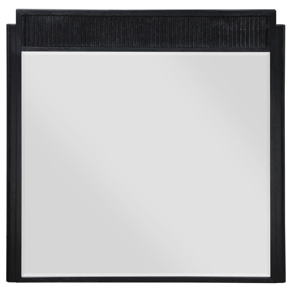 Upgrade your bedroom with the fresh, refined style of a four-piece modern bedroom set. In black, the set features ivory upholstery with vertical channel tufting on bed, creating a chic focal point. The nightstand and dresser are each adorned with fluted details and gold finish demi-lune pulls that add sophistication. The set offers ample storage for clothing and accessories, and is complete with a framed mirror on top of the dresser, adding depth to your bedroom setting. Each piece stands on tapered legs, adding a touch of airy character to the set as a whole.