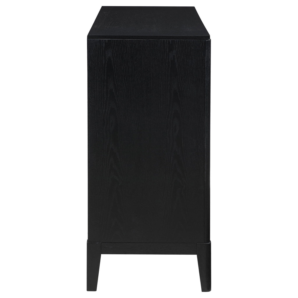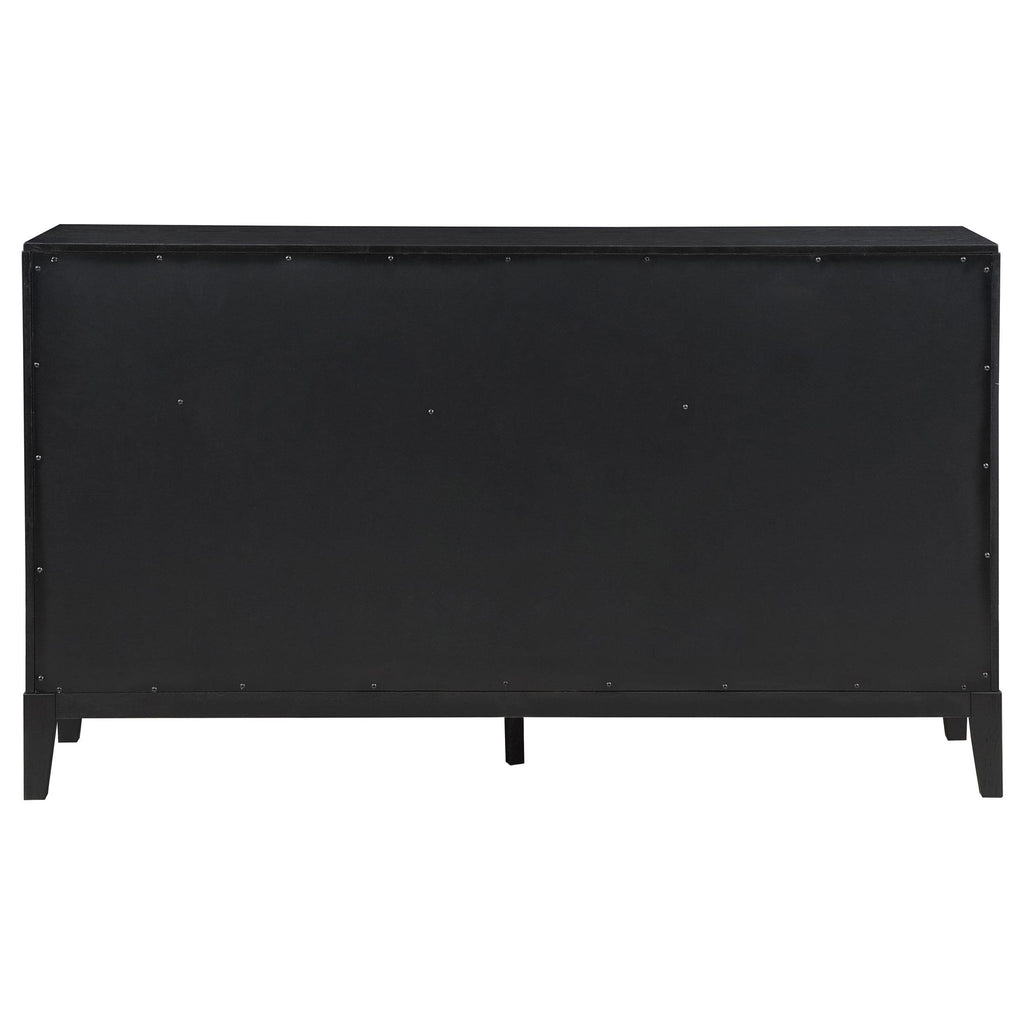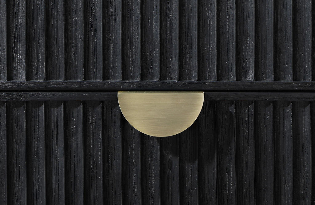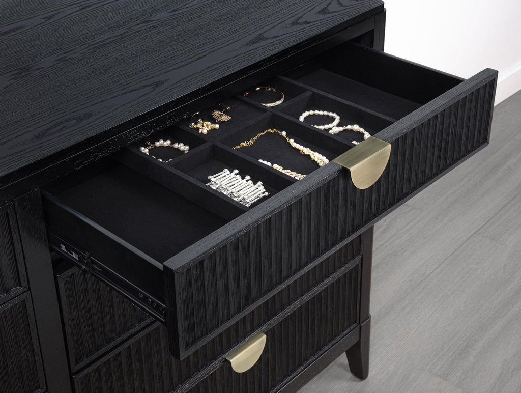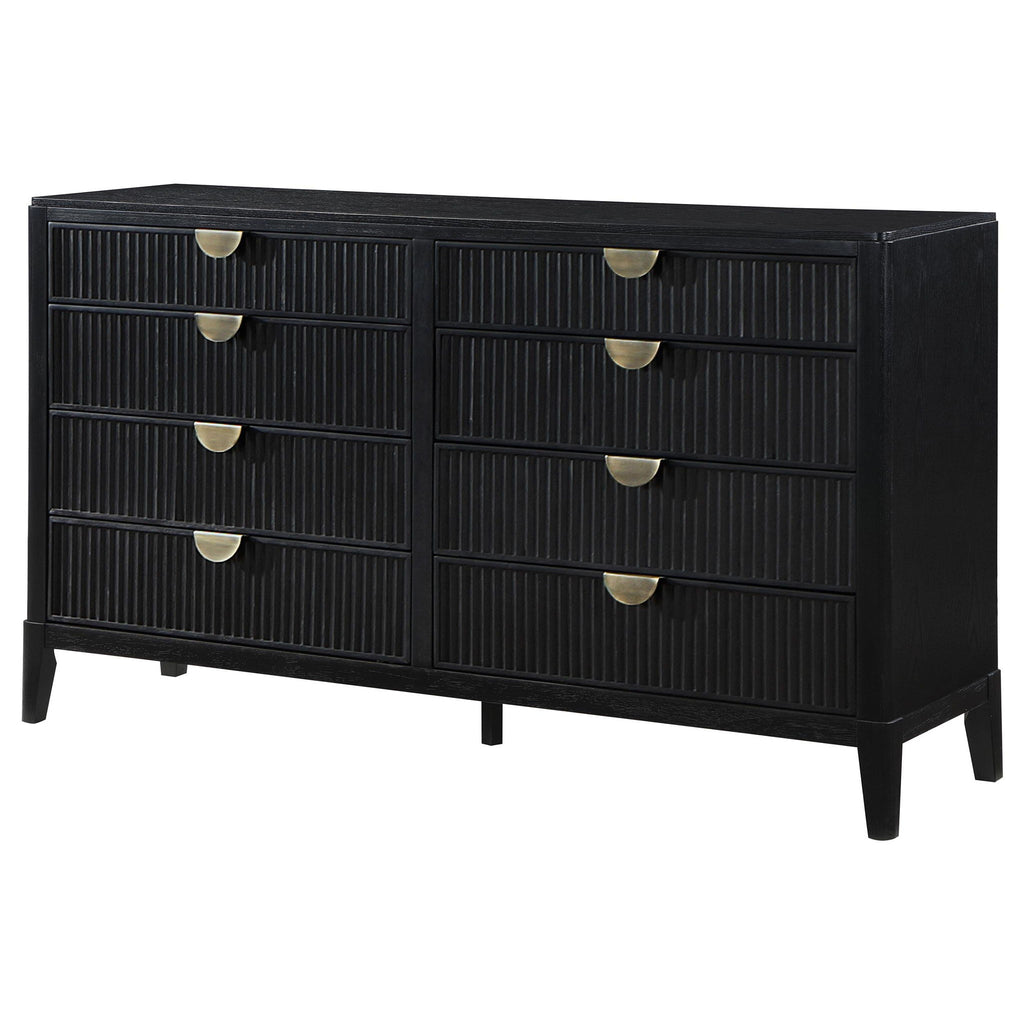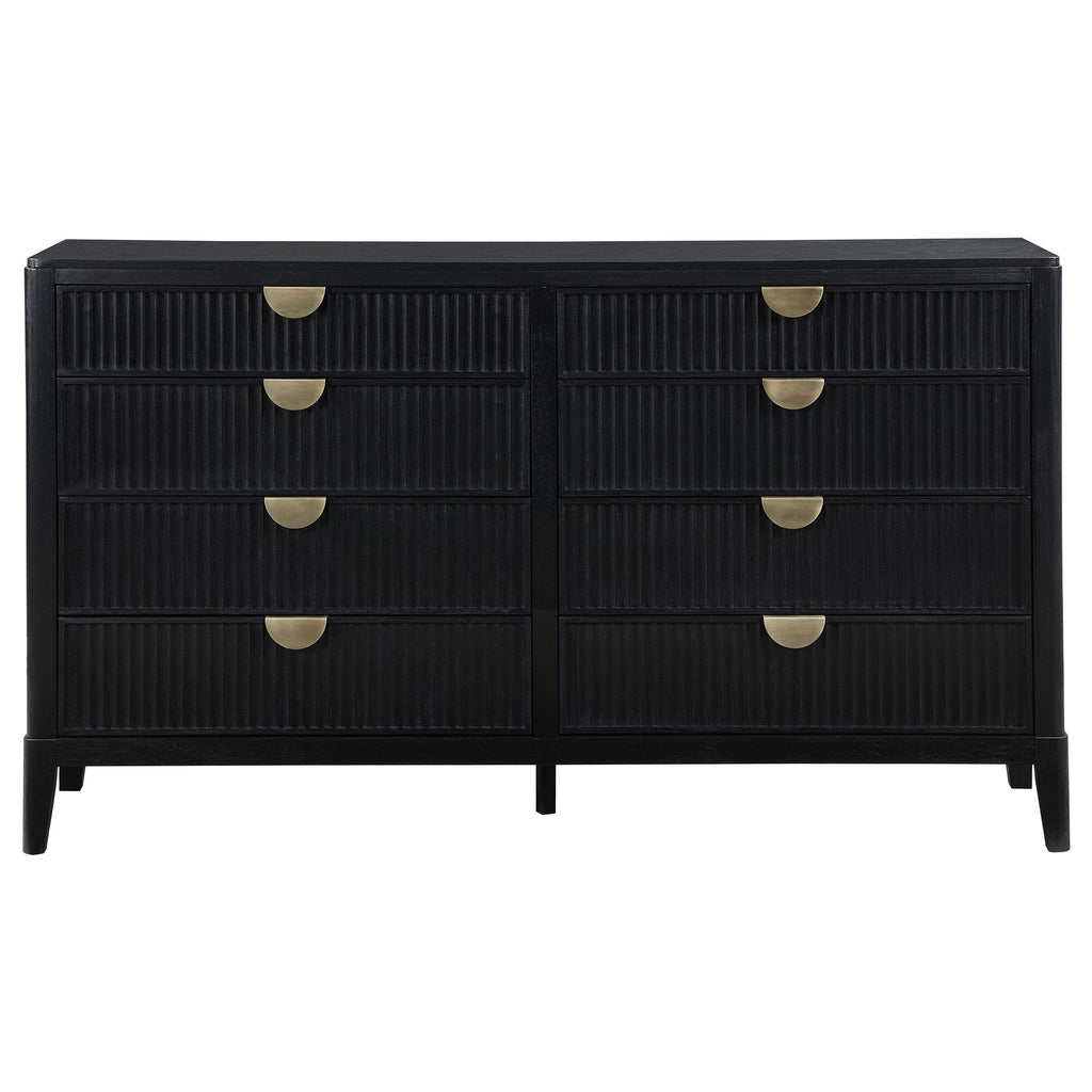 Create a single place to organize clothing and accessories with a stylish, modern eight-drawer dresser. Its timeless stance is augmented with a black finish complete with wire brushing that creates subtle texture and dimensionality. Drawer fronts offer fluted texturing, creating a sense of depth and movement. Half-moon drawer pulls complete the look with a soft golden metallic finish that gleams in the light and adds impeccable warmth. Top drawers include felt lining to protect your delicates, while lower drawers are larger, perfect for everything from sweaters to linens.
