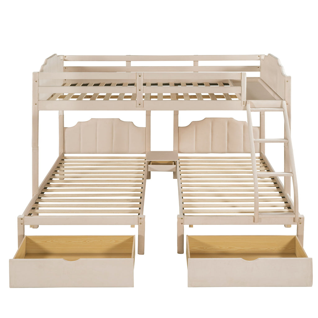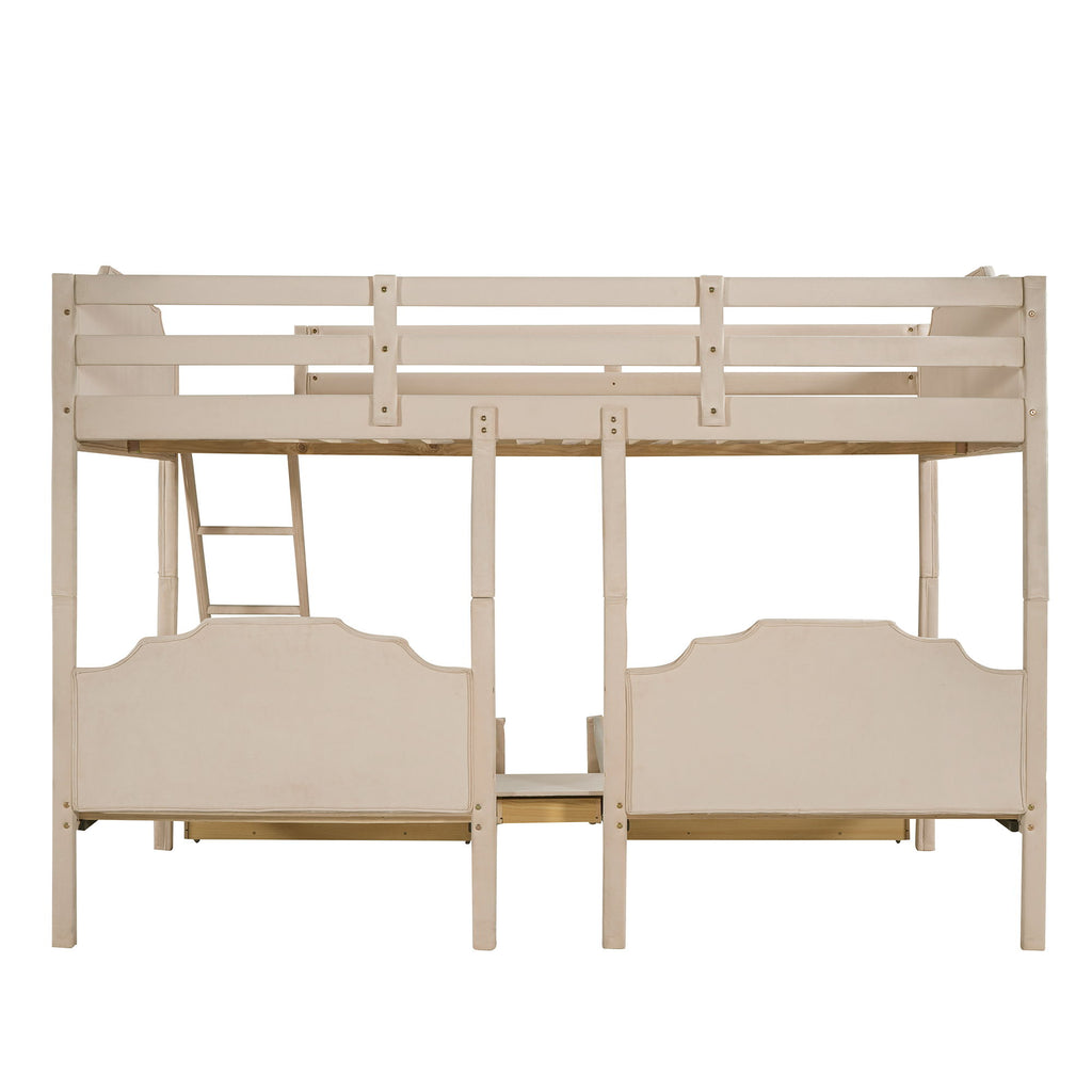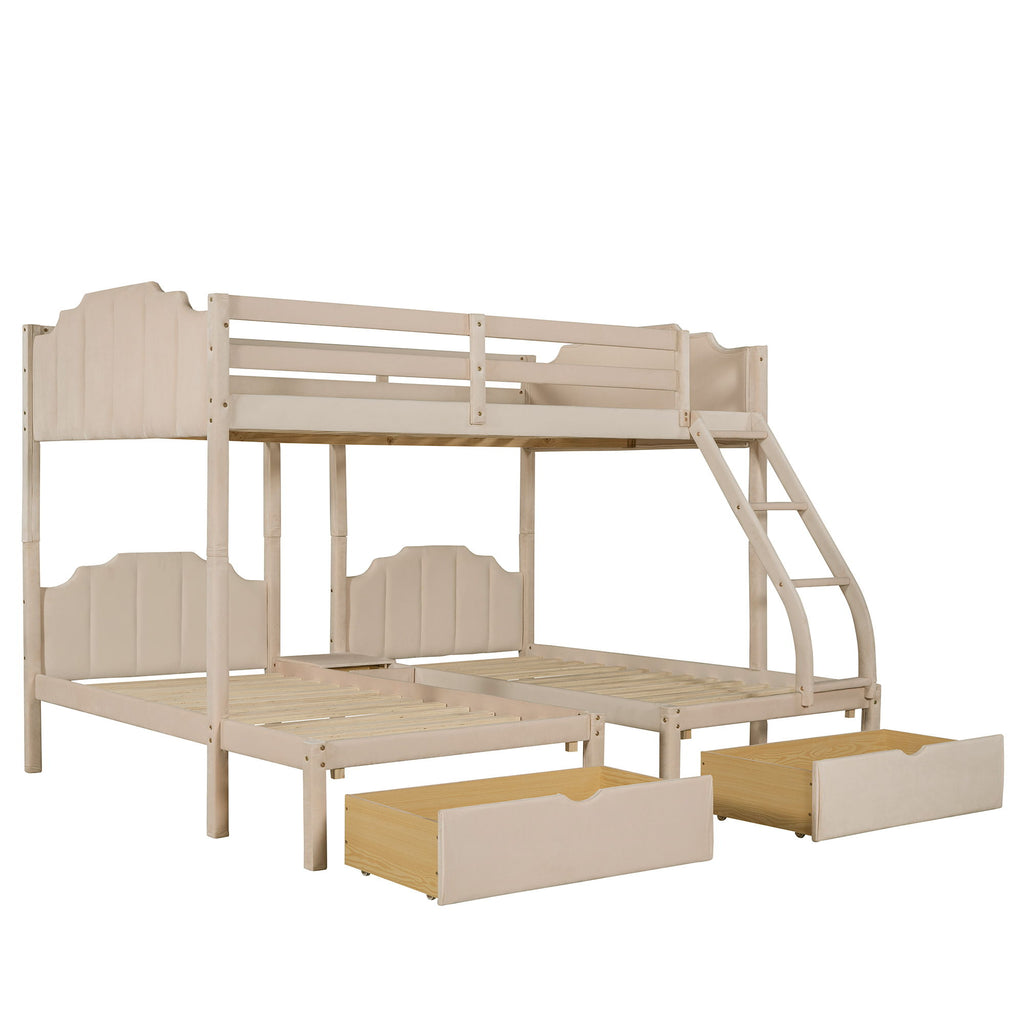 Full Over Twin & Twin Triple Bunk Bed With Drawers And Guardrails - Beige