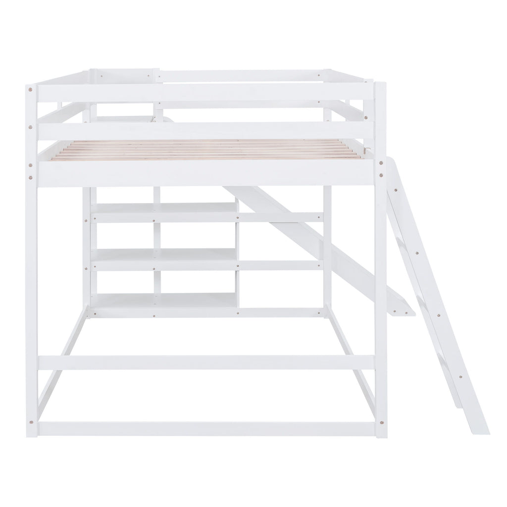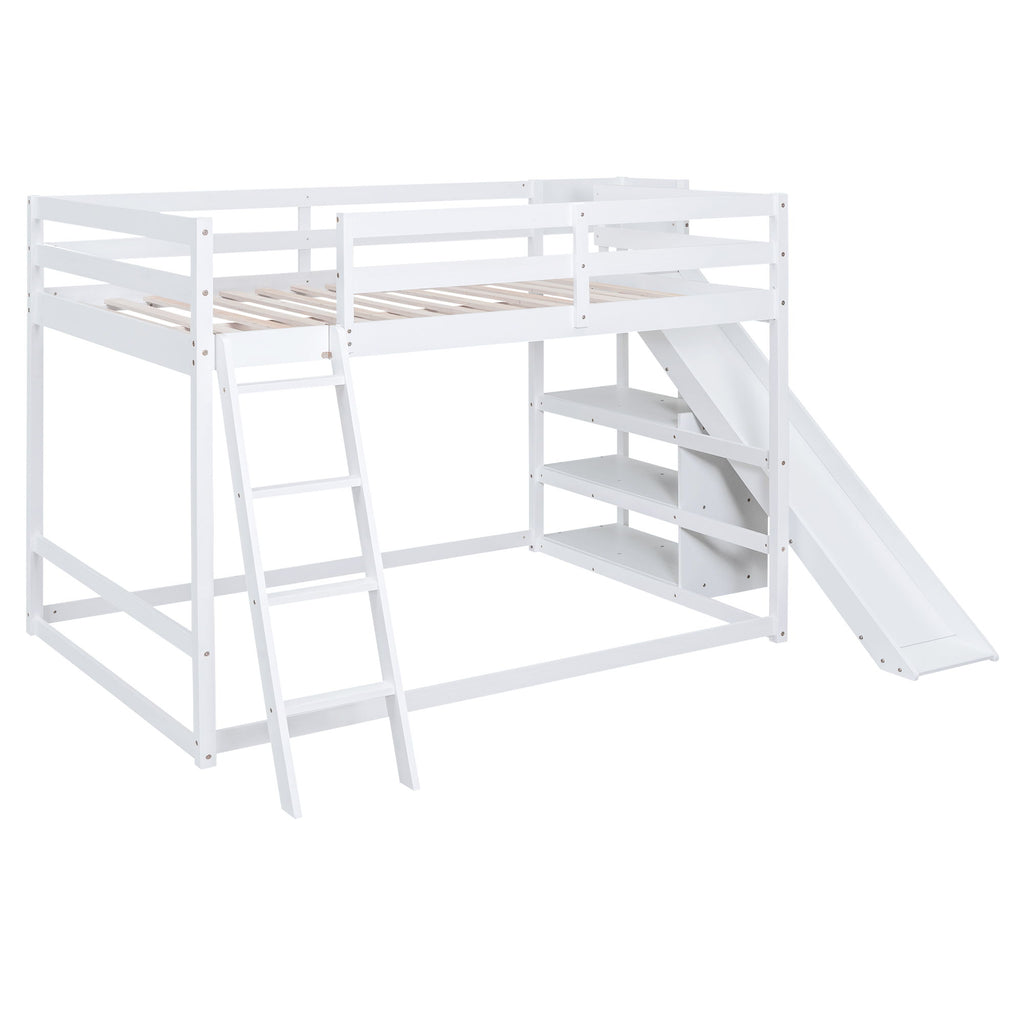 Full Over Full Bunk Bed With Ladder, Slide, And Shelves - White