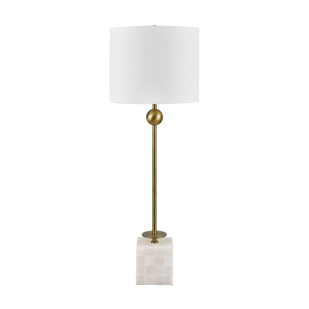 The Crestview Collection Callie Buffet Lamp exudes elegance with its slender design and tessellated alabaster block base. Soft gold accents complement the luxurious look, while the white linen shade adds a refined touch. Perfect for adding understated sophistication to any space.
