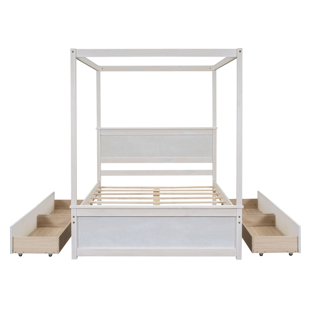 Full Size Canopy Platform Bed With 4 Drawers And Support Slats, No Box Spring Needed - Brushed White