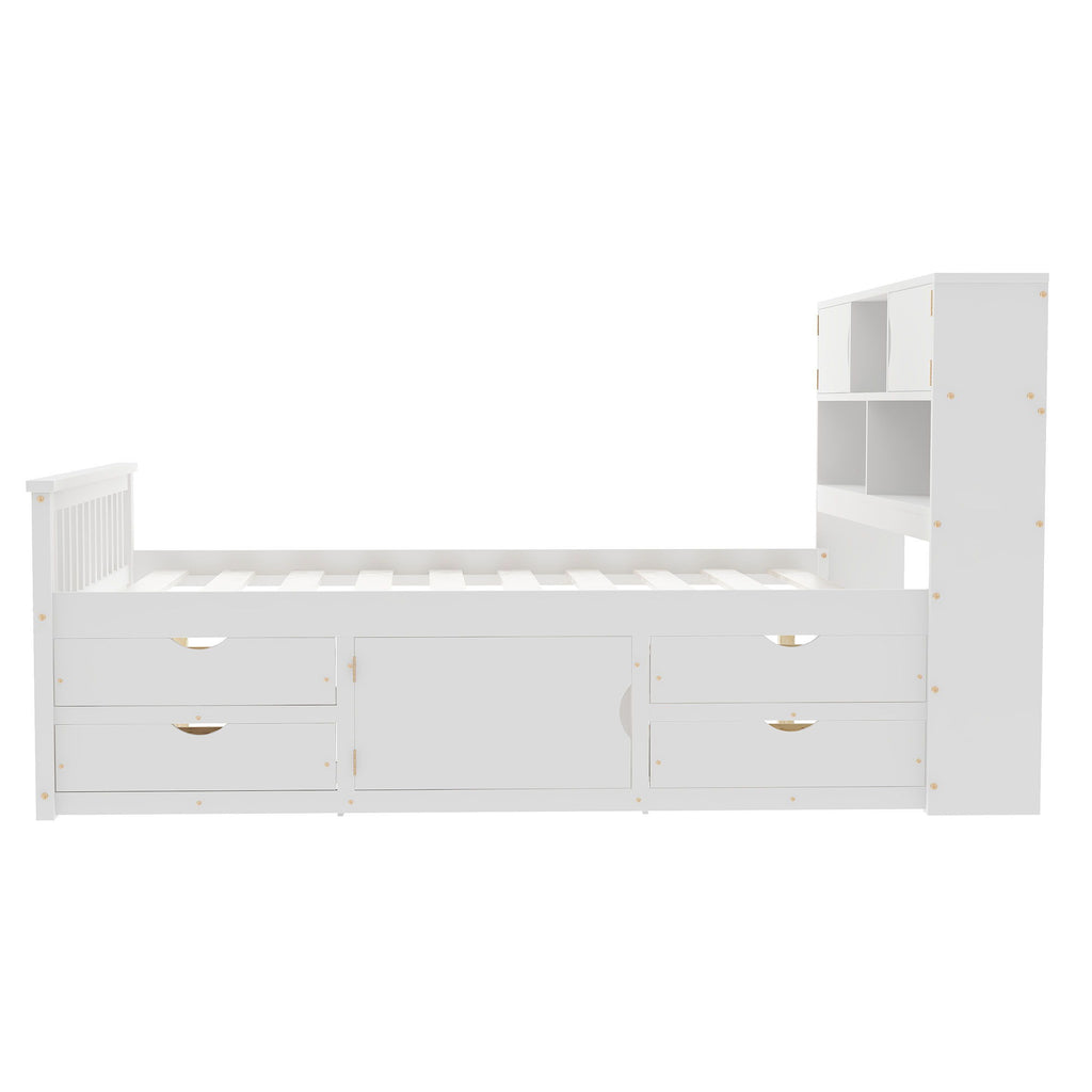 Full Size Captain Platform Bed Frame With Bookcase Headboard, Four Drawers, Storage Shelves - White