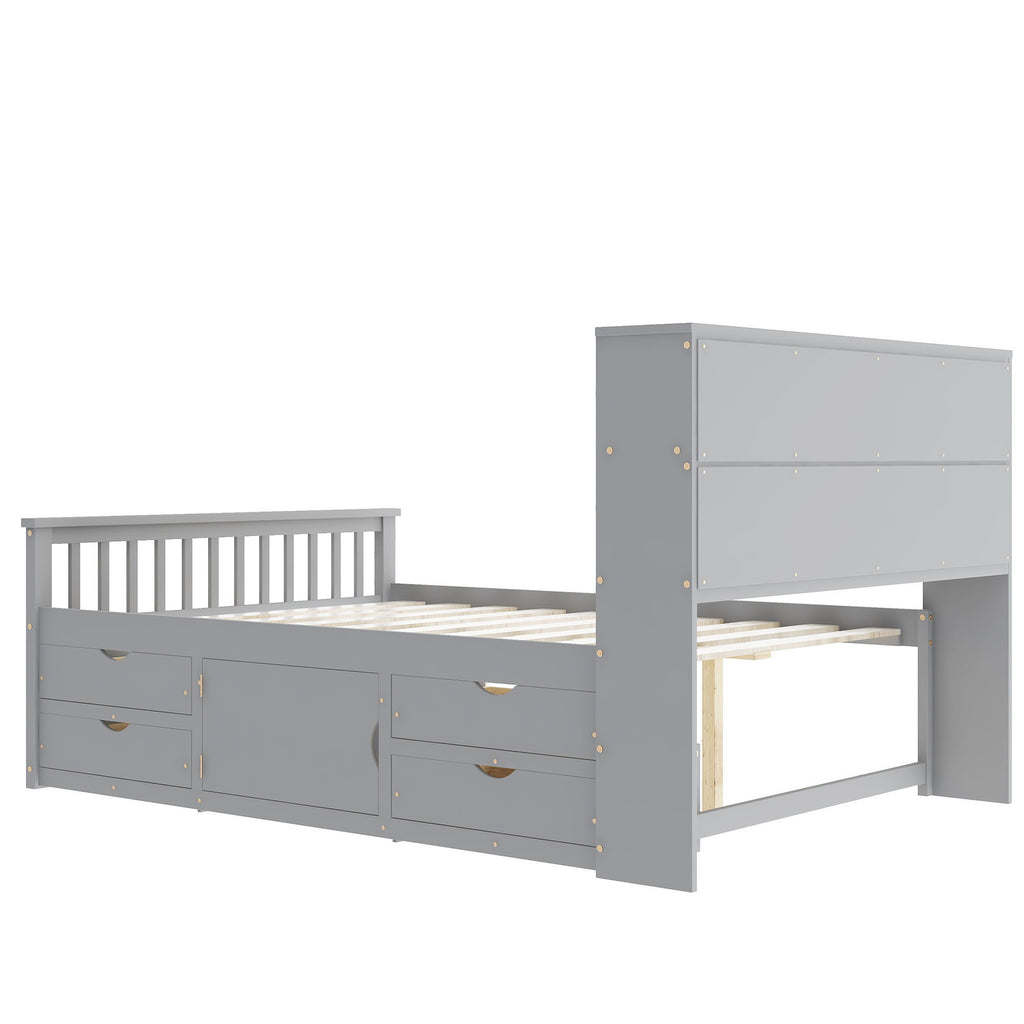 Full Size Captain Platform Bed Frame With Bookcase Headboard, Four Drawers, Storage Shelves - Gray