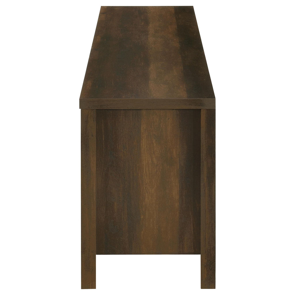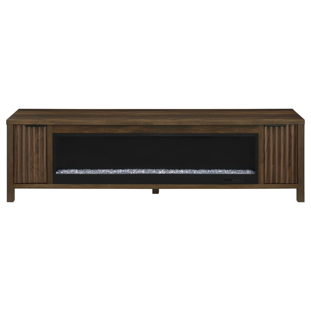 Flickering firelight glows behind glass, casting warmth and ambiance in perfect harmony. This media console fuses utility and romance, with slatted cabinet doors and an electric fireplace that offers visual charm without a heat function. Its dark pine finish anchors the space with rustic elegance, while generous surface and storage support your modern lifestyle. Whether used as a TV stand, media console, or hearth-inspired cabinet, it invites connection in every season.