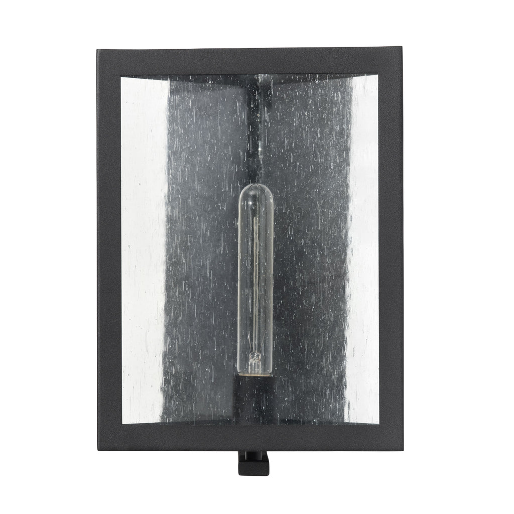 Sophisticated matte black framing encases 3 pieces of heavily seeded and wavy glass that forms a triangular shape and floats from a matte black back plate. Illuminate stairwells , hallways, or even artwork with this contemporary wall sconce. Available in two sizes.
