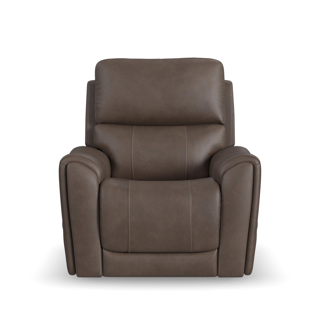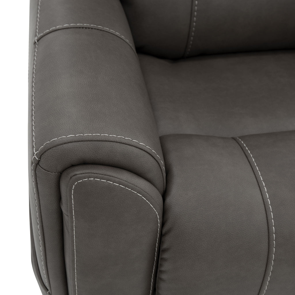 Power up and enjoy secretive perks with the Carter power recliner. This piece features triple power and our Zero Gravity mechanism, allowing you to customize the recline, headrest and lumbar support on both seats, including reclining to a zero-gravity position for the ultimate comfort experience. This recliner will be a statement in your home with its genuine leather look that is a durable, easy to clean fabric in two color choices. Flared arms, a contoured seat and heavy thread stitching details give it a sleek, yet striking look. And it all comes with pop-out cupholders in the arms for discreet storage.