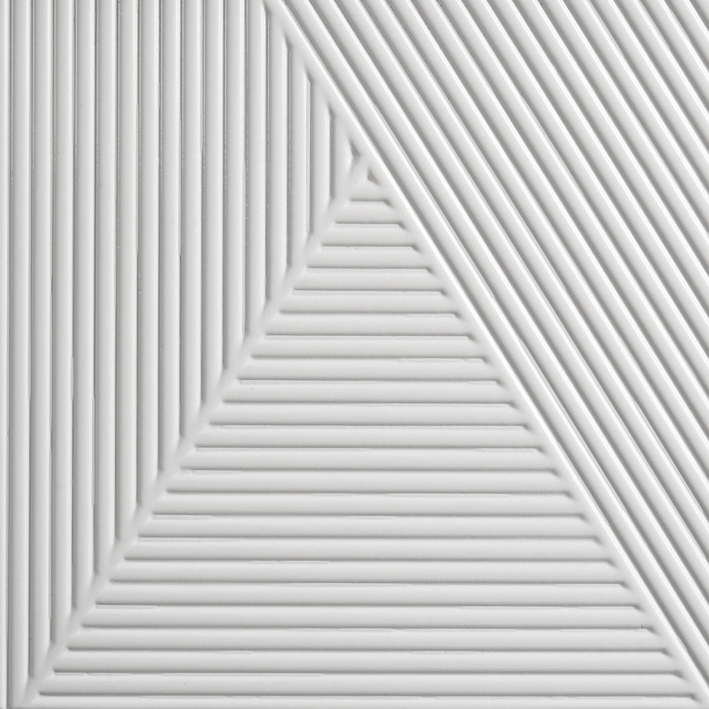 Crisp white high gloss and sculptural textures define this modern bedroom set, blending sleek surfaces with dimensional details. Geometric drawer fronts feature ribbed V-patterns and polished chrome pulls, while all drawers glide smoothly on 45mm metal extension hardware. The headboard stands out with chevron-tufted white faux leather framed by soft white LED trim. Completing the ensemble, a coordinating LED dresser mirror adds ambient glow and polished symmetry to the space. Elevated on chrome legs, this set is a showcase of contemporary form and function.