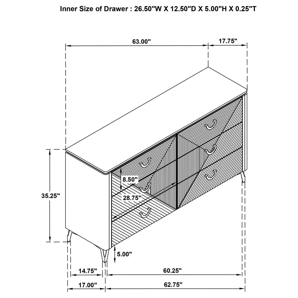 Sleek and sculptural, this six-drawer dresser pairs crisp white high gloss with dimensional detail for a bold modern look. Its geometric drawer fronts feature ribbed textures forming inverted V patterns, highlighted by polished chrome U-shaped pulls. Felt-lined top drawers add a refined interior touch, while smooth-gliding drawers operate on 45mm metal extension glides hardware. Finished with slender legs and clean lines, this dresser brings texture and brightness to contemporary bedrooms.