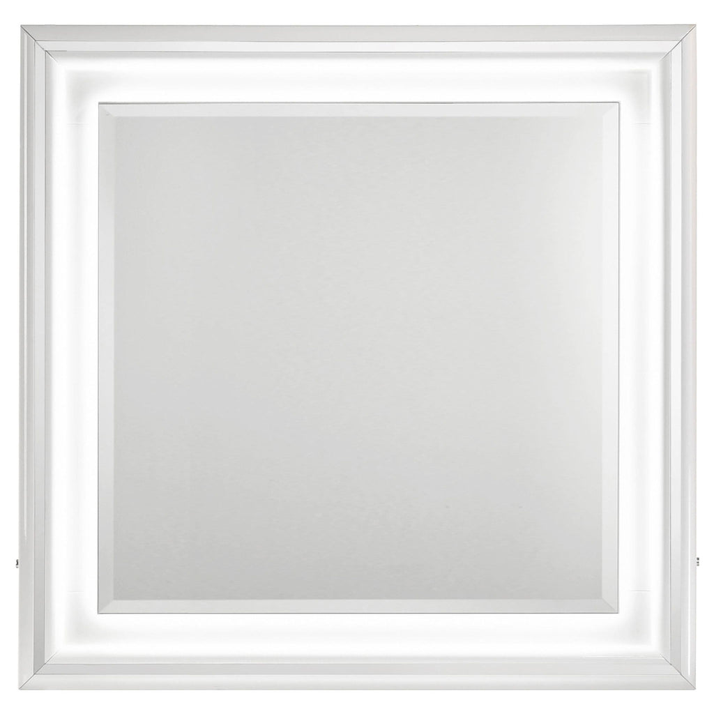 Framed in crisp white high gloss, this modern dresser mirror pairs perfectly with its matching six-drawer dresser for a cohesive contemporary look. A beveled edge and recessed inner panel create depth, while integrated white LED lighting offers soft illumination. Designed to enhance both function and style, this mirror brings clean lines and ambient glow to any modern bedroom setup.